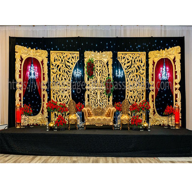 แผงไฟเบอร์ดีไซเนอร์สำหรับตกแต่งเวทีแต่งงานแบบอาหรับกรอบรูปฉากหลังสีทองสั่งทำได้สำหรับงานเลี้ยงสังสรรค์ในงานปาร์ตี้