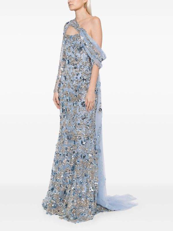 Designer Floral Chiffon Evening Party Dress One Shoulder High-Low with Long Sleeves Embellished Sequins Beads A-Line Silhouette