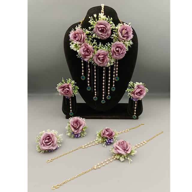 ชุดสร้อยคอออกแบบลายดอกไม้สำหรับ haldi Mehndi และชุดสร้อยคอดอกไม้เจ้าสาวพร้อมต่างหูและโซ่มือสำหรับผู้หญิง