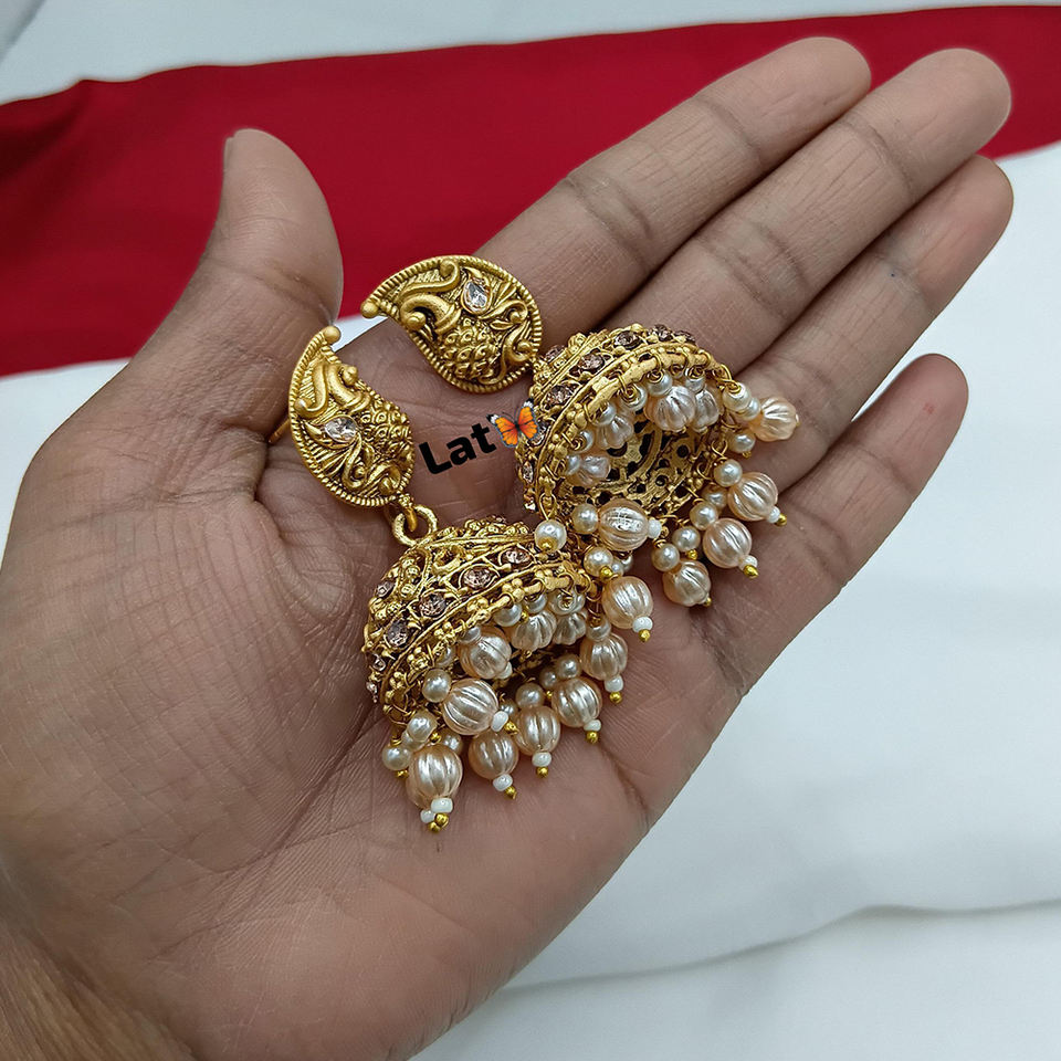 Designer Gold Finish Jhumki Earrings Embellished with Pota Stones and Pearls Festive & Bridal Jewelry