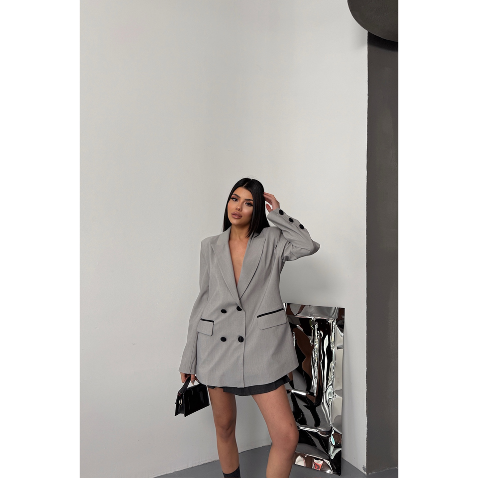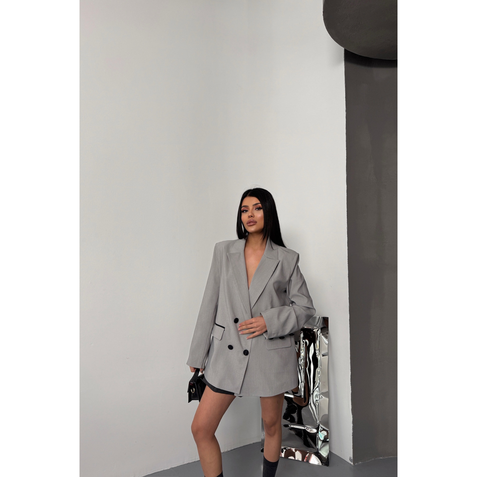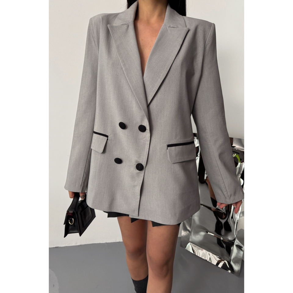 เสื้อแจ็คเก็ตผู้หญิงสีเทา ดีไซน์เนอร์ พร้อมกระดุมและผ้าคลุม