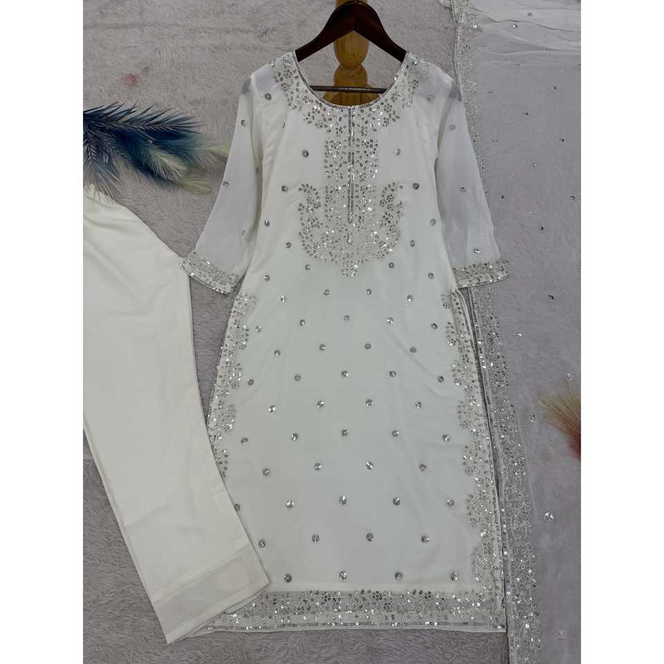 ชุดเสื้อผ้าผู้หญิงสีขาว HK พร้อมผ้าคลุมไหล่ ปักลายและประดับเลื่อม ไซส์ L