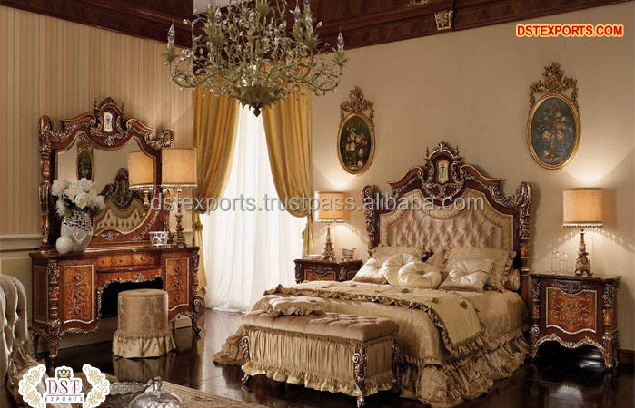 เตียงแกะสลักมือดีไซน์เนอร์พร้อมโต๊ะข้างเตียงขนาดคิงไซส์แกะสลักพร้อมโต๊ะข้างเตียงเฟอร์นิเจอร์ห้องนอนสีทองมันวาวสูง
