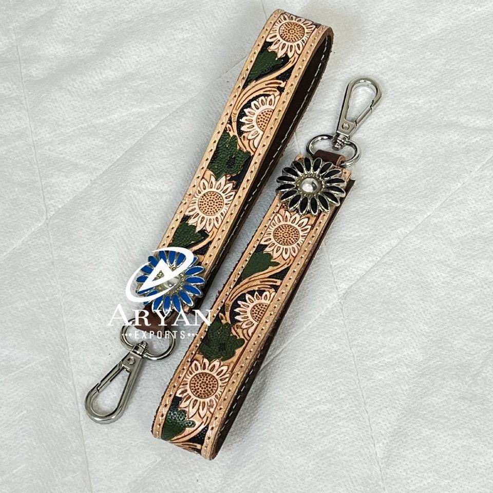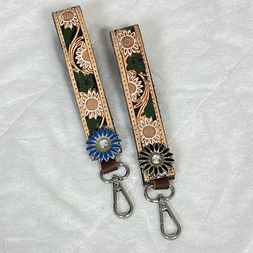 Designer Hand Tooled Cow Leather Wristlet Keychain Strap with Sunflower Metal Concho and Lobster Clasp Western Style Key Holder
