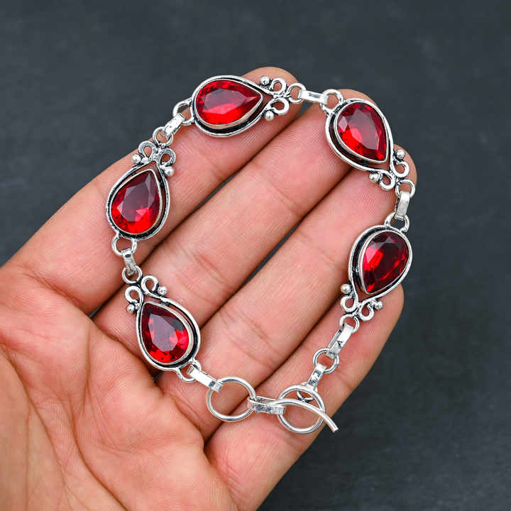 สร้อยข้อมือโซ่ชุบเงิน925แฮนด์เมดดีไซน์เนอร์อัญมณีโกเมนสีแดงที่ผ่านการทำจากห้องปฏิบัติการของขวัญเครื่องประดับชั้นดีสำหรับผู้หญิง