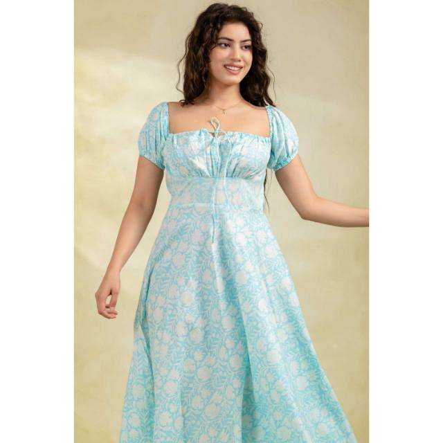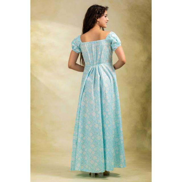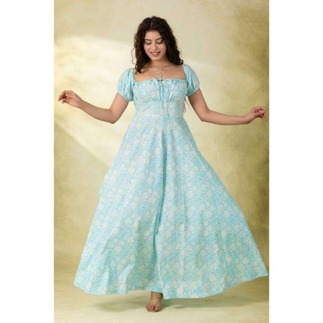 เดรสยาวผ้าฝ้ายพิมพ์ลายบล็อกทำมือ ดีไซน์เนอร์, เดรสแม็กซี่สไตล์โบโฮสำหรับผู้หญิง, เหมาะสำหรับใส่ไปเที่ยวทะเลและงานเทศกาลในช่วงฤดูร้อน