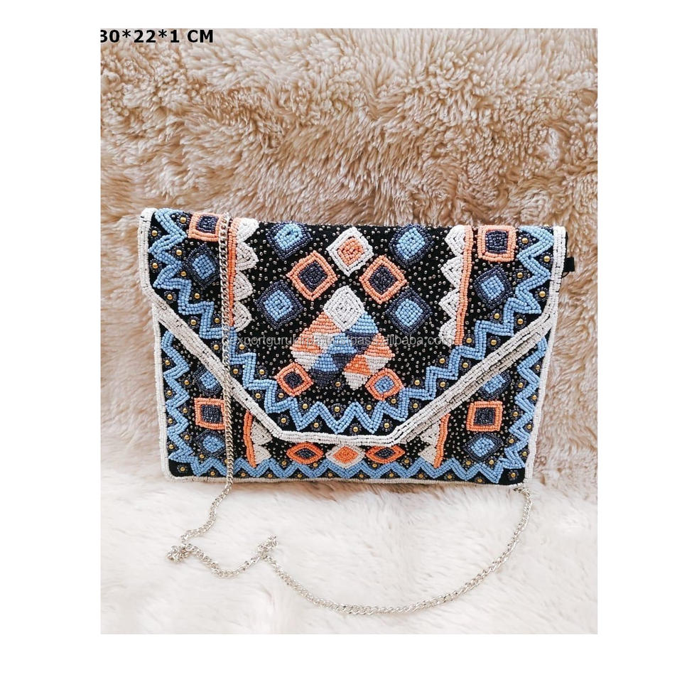 กระเป๋าคลัทช์สะพายไหล่สไตล์โบฮีเมียนสำหรับผู้หญิง ดีไซน์เนอร์ทำมือ ปักลายเรขาคณิต วัสดุปอกระเจาเป็นมิตรกับสิ่งแวดล้อม เหมาะสำหรับงานกลางคืนและช้อปปิ้ง