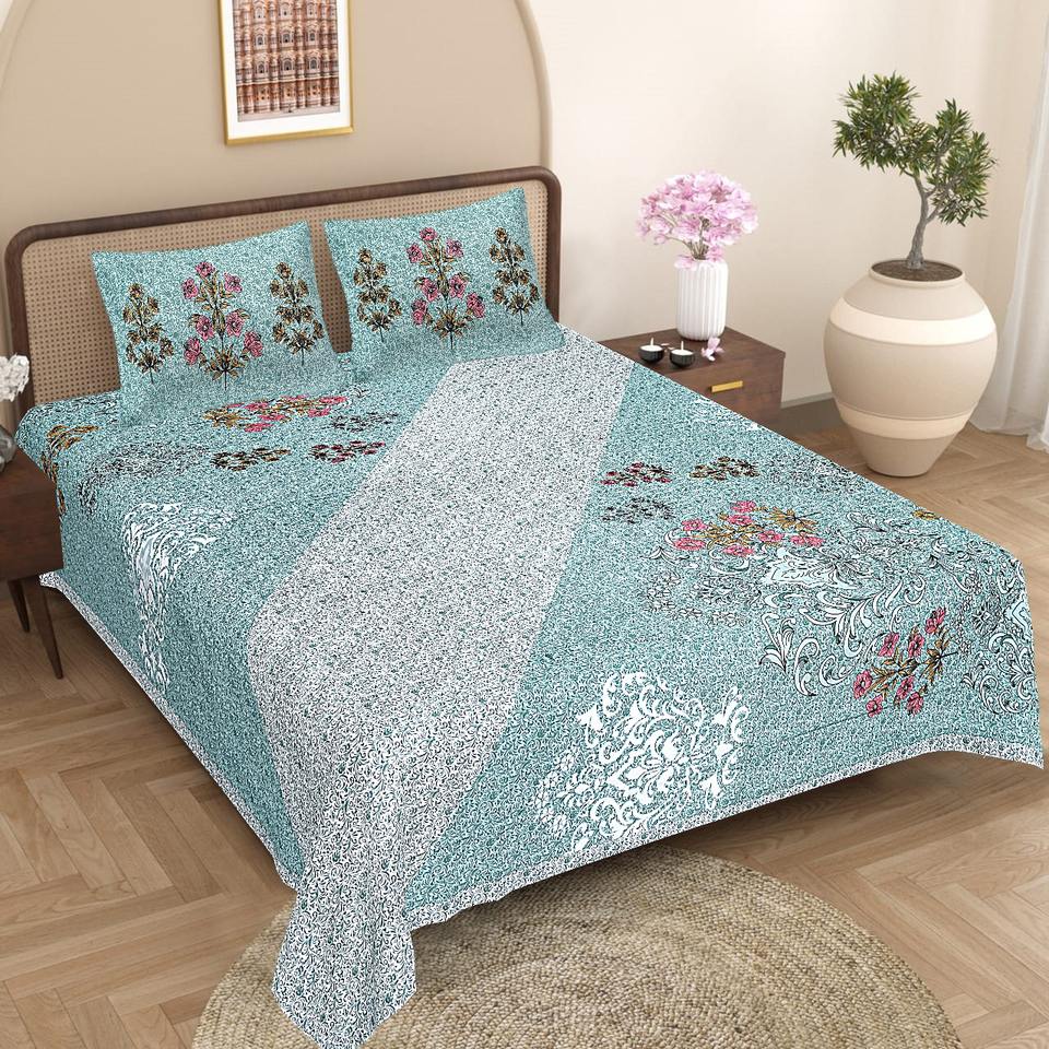 ชุดเครื่องนอนผ้าฝ้ายอินเดียแท้ 100% พร้อมปลอกหมอน ชุดเครื่องนอนลายพิมพ์บล็อกด้วยมือ ผ้าปูที่นอนและปลอกหมอนลายพิมพ์แบบชาติพันธุ์