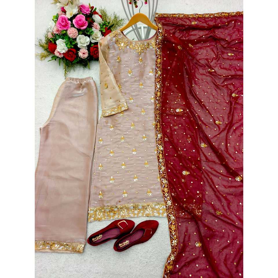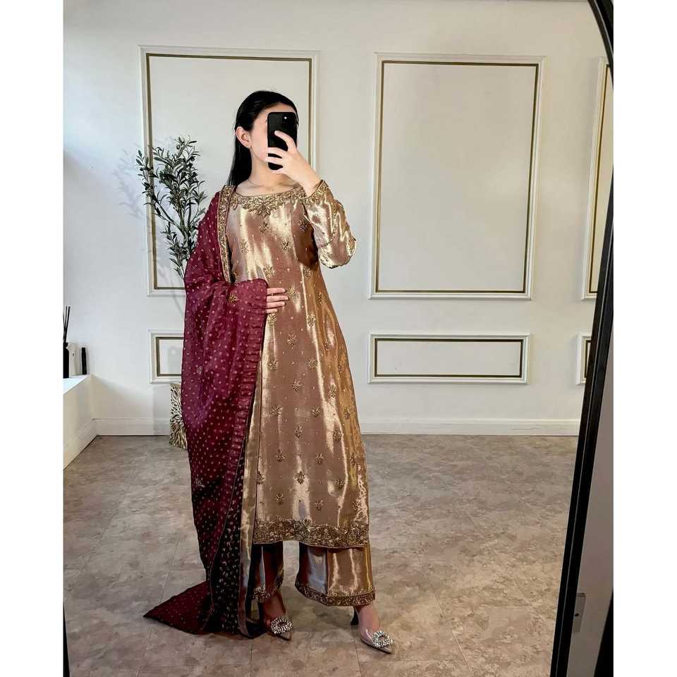 ชุดออกแบบโดยดีไซเนอร์ชาวอินเดียและปากีสถาน เสื้อปาร์ตี้ปักลายหรูหรา พร้อมกางเกงพลazzo และผ้าคลุมไหล่