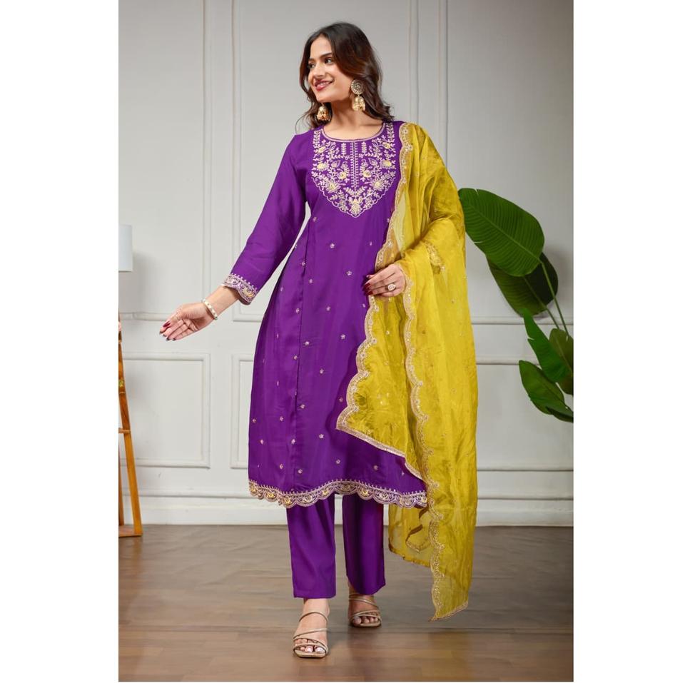 ชุดคุर्ตาดีไซเนอร์ ผ้าไหมโรมัน ปักลายด้วยเลื่อม ชุดคุर्ติแบบปากีสถาน กางเกงพร้อมผ้าคลุมไหล่ จากซัพพลายเออร์อินเดีย