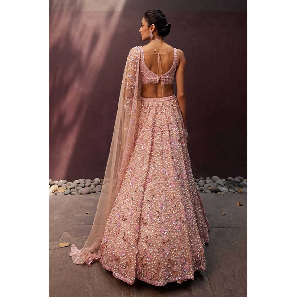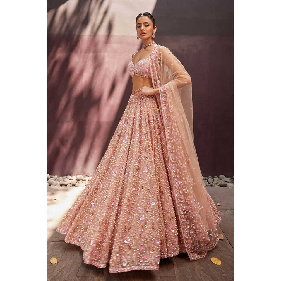 ชุดเลเฮนกาโชลีแบบดีไซน์เนอร์สีพีชสำหรับงานแต่งงาน ทำจากผ้าโพลีเอสเตอร์ ประดับด้วยดิ้นดอริ เลื่อม และลูกปัดมุก