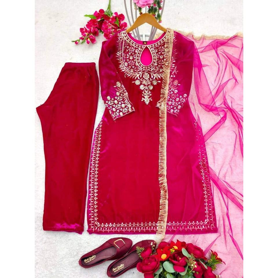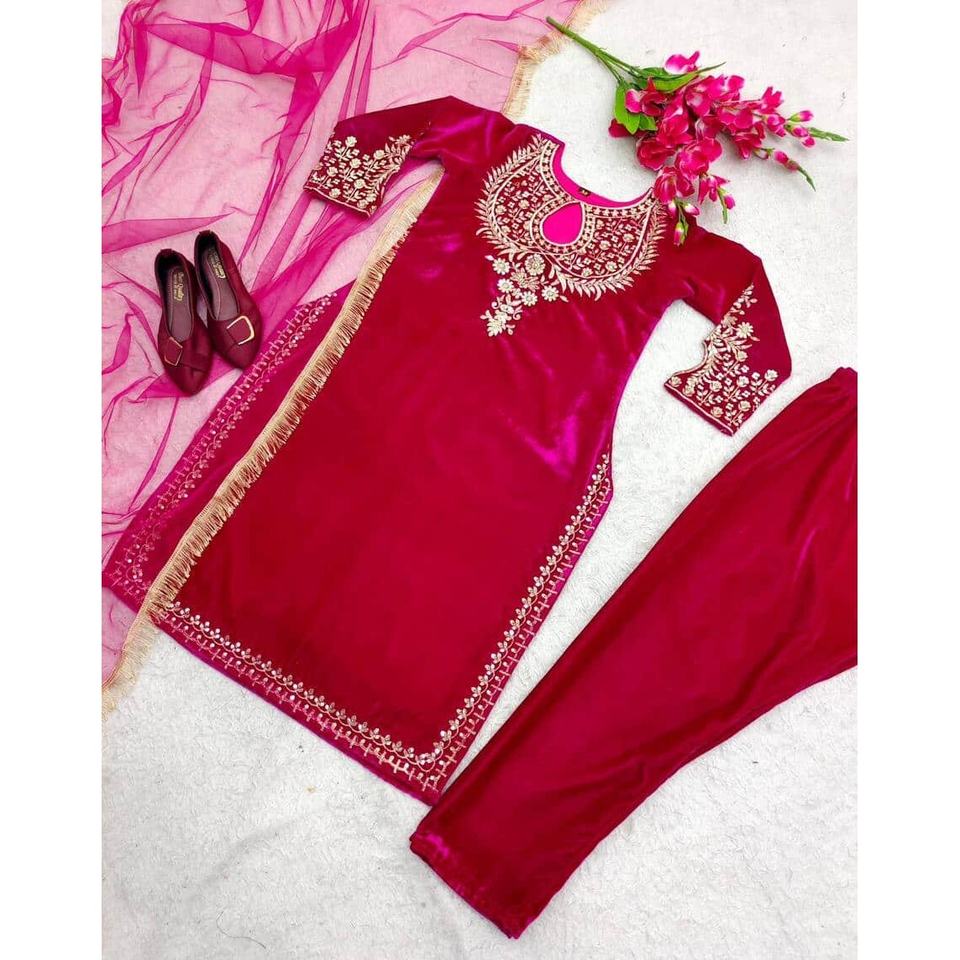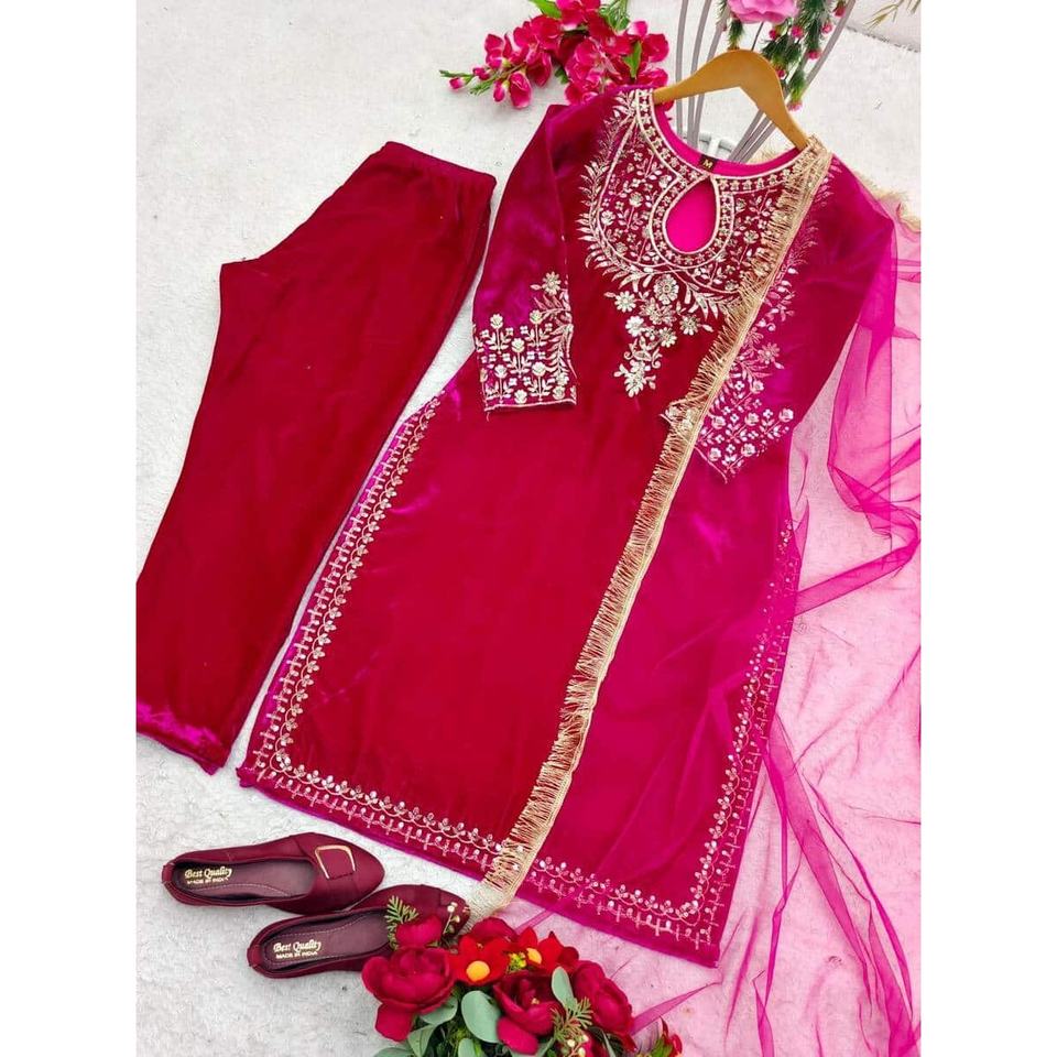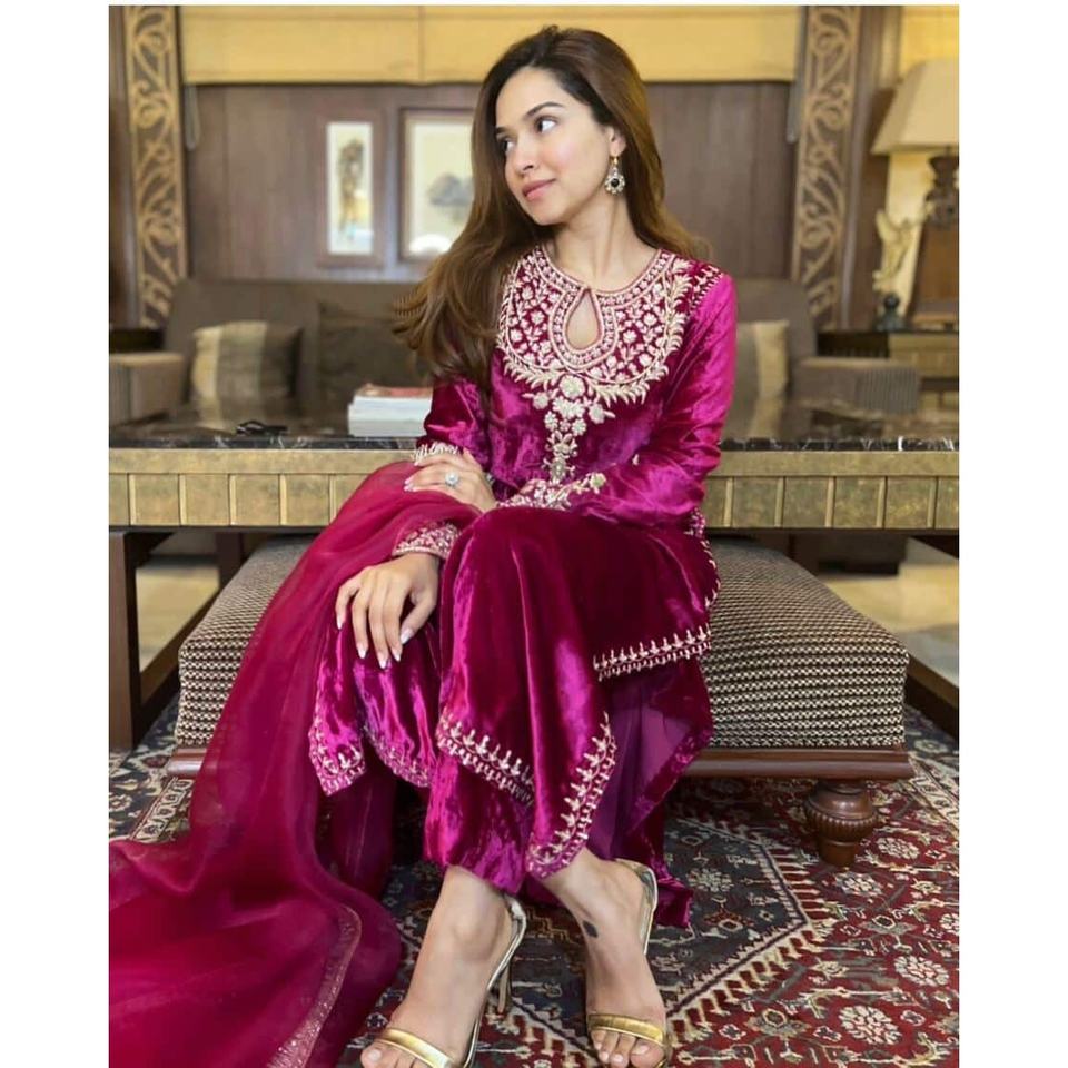 ชุดเดรสราตรีผ้ากำมะหยี่สีม่วงแดงออกแบบโดยดีไซเนอร์ชุดเดรสราตรีแบบสุภาพด้านบนด้านล่างและ dupatta