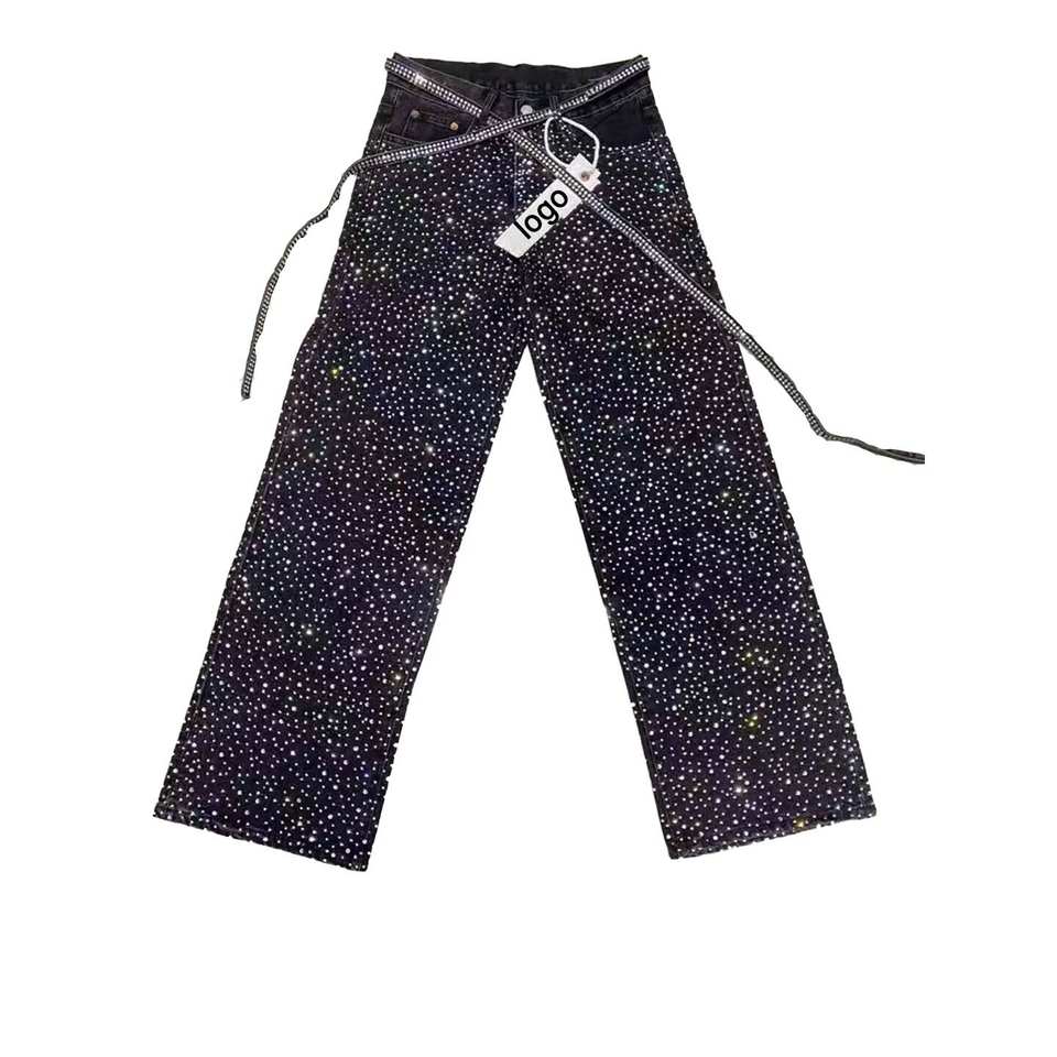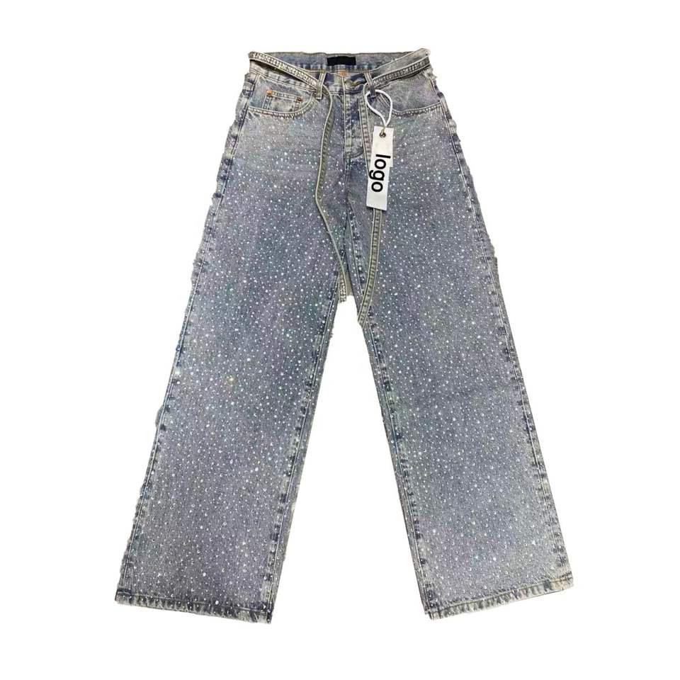 กางเกงยีนส์ผู้ชายทรงหลวมเอวสูงสีพื้นแบบฟอกขนาดกลาง ดีไซน์ขอบดิบประดับคริสตัลเต็มตัว สไตล์สตรีทสำหรับฤดูหนาว