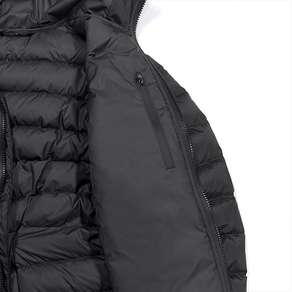 เสื้อแจ็คเก็ตฤดูหนาวผู้ชายแบบดีไซเนอร์ เสื้อพัฟเฟอร์สีดำกันน้ำเนื้อนุ่มสั่งทำพิเศษ พร้อมฮู้ดและโลโก้ด้านหน้า-ขายส่งพร้อมจัดส่งแบบ DDP