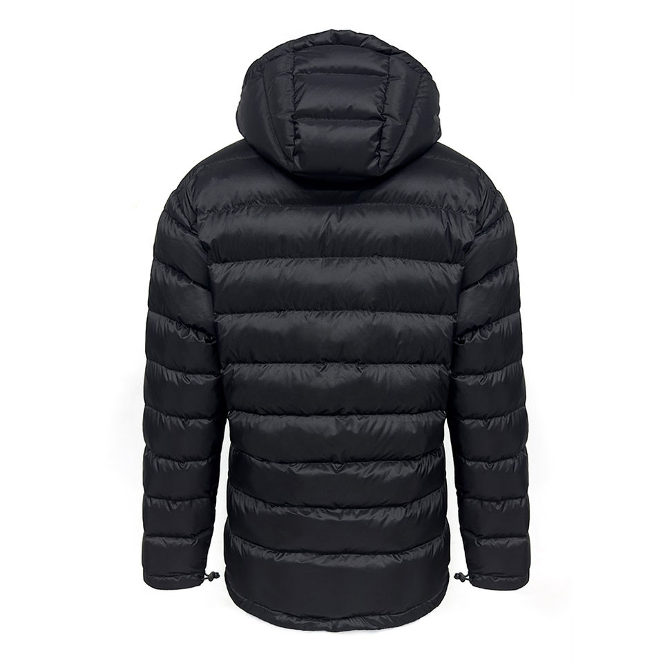 เสื้อแจ็กเก็ตฤดูหนาวของผู้ชายเสื้อโค้ทขนเป็ดสีดำกันน้ำมีฮู้ดติดโลโก้ด้านหน้า