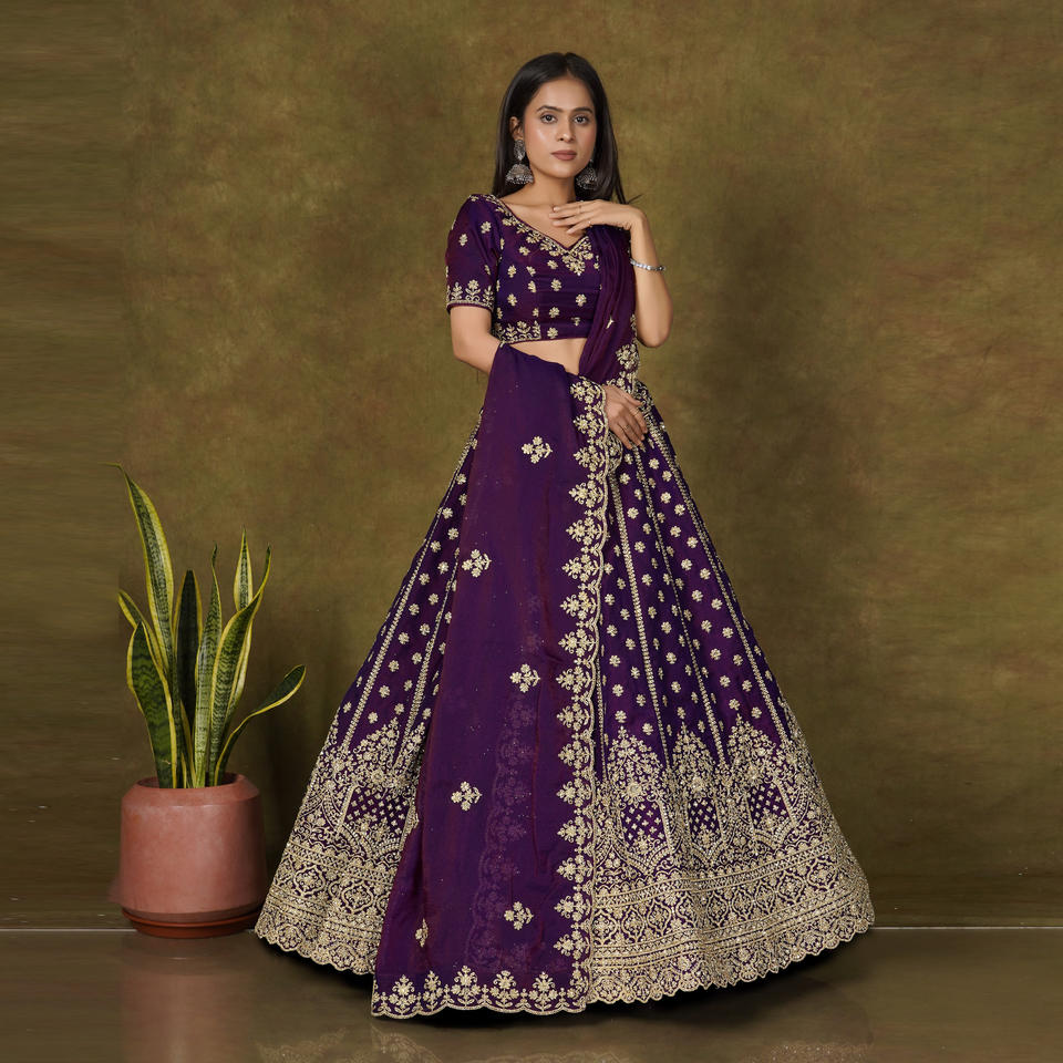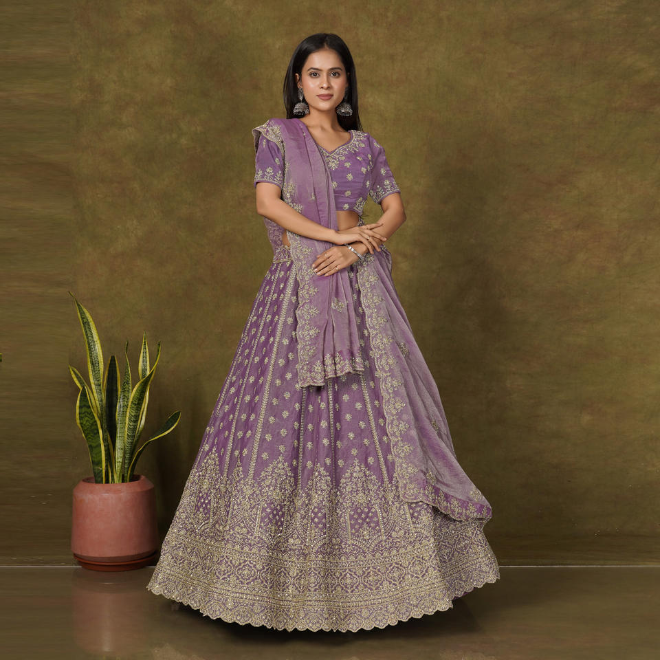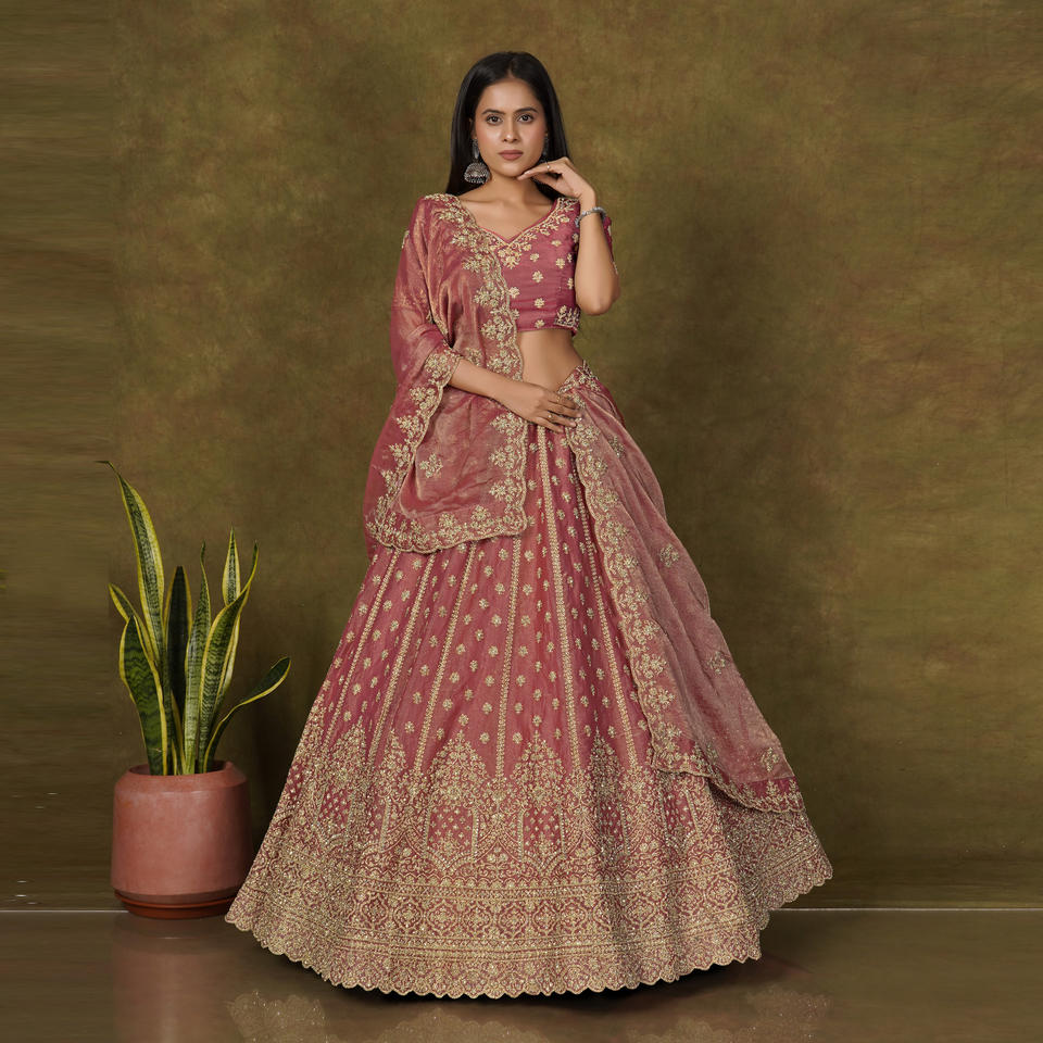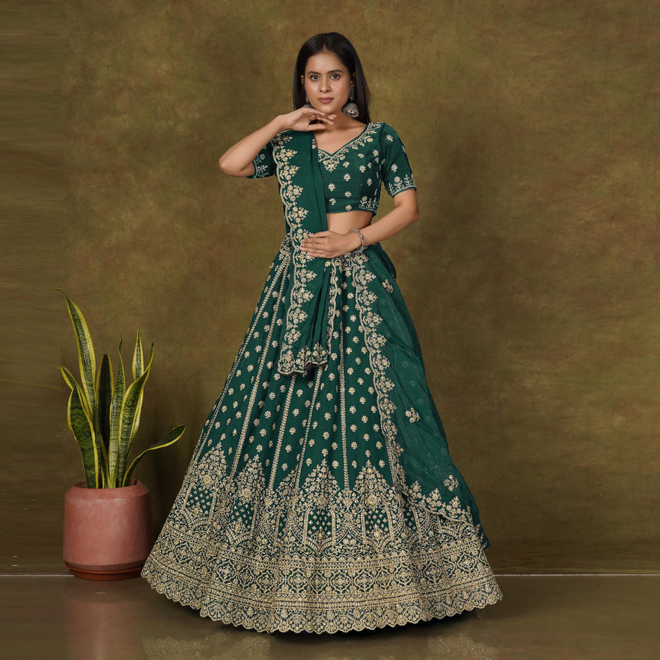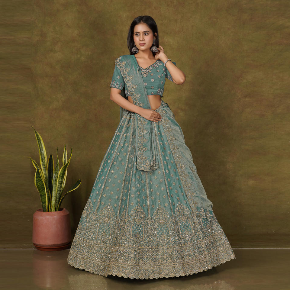 ชุดเลเฮนกาโชลีดีไซน์เนอร์ Moss Finish พร้อมลายปักดิ้นทองสุดประณีต ขอบตกแต่งอย่างหรูหรา พร้อมผ้าคลุมไหล่ Dupatta สำหรับงานเทศกาล