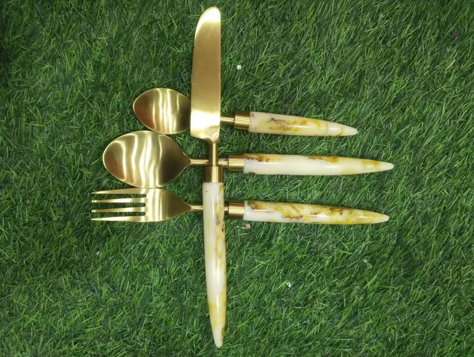 ชุดช้อนส้อมด้ามเรซิ่นลายหินอ่อนสีขาวนวล ดีไซน์เนอร์ออกแบบ พร้อมเคลือบทอง สำหรับโรงแรม ร้านอาหาร และการรับประทานอาหารในบ้านหรู จากประเทศอินเดีย