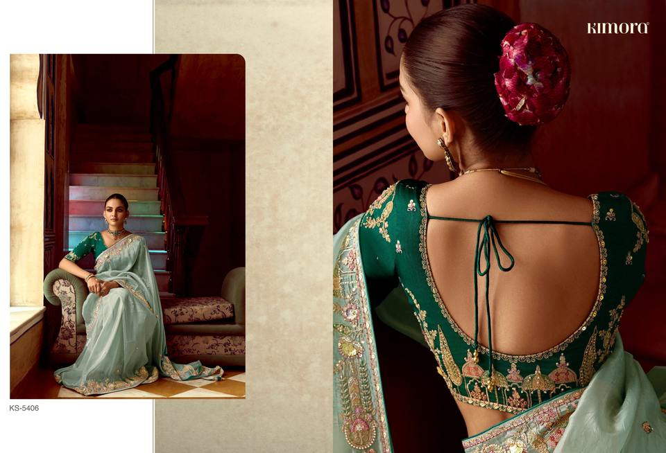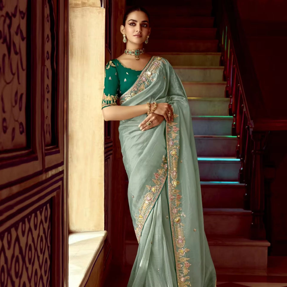 ชุดเดรสปาร์ตี้แต่งงานหรูหราทำจากผ้าไหมจากงานทอ zari ทอจากปากีสถานส่าหรีดีไซน์เนอร์