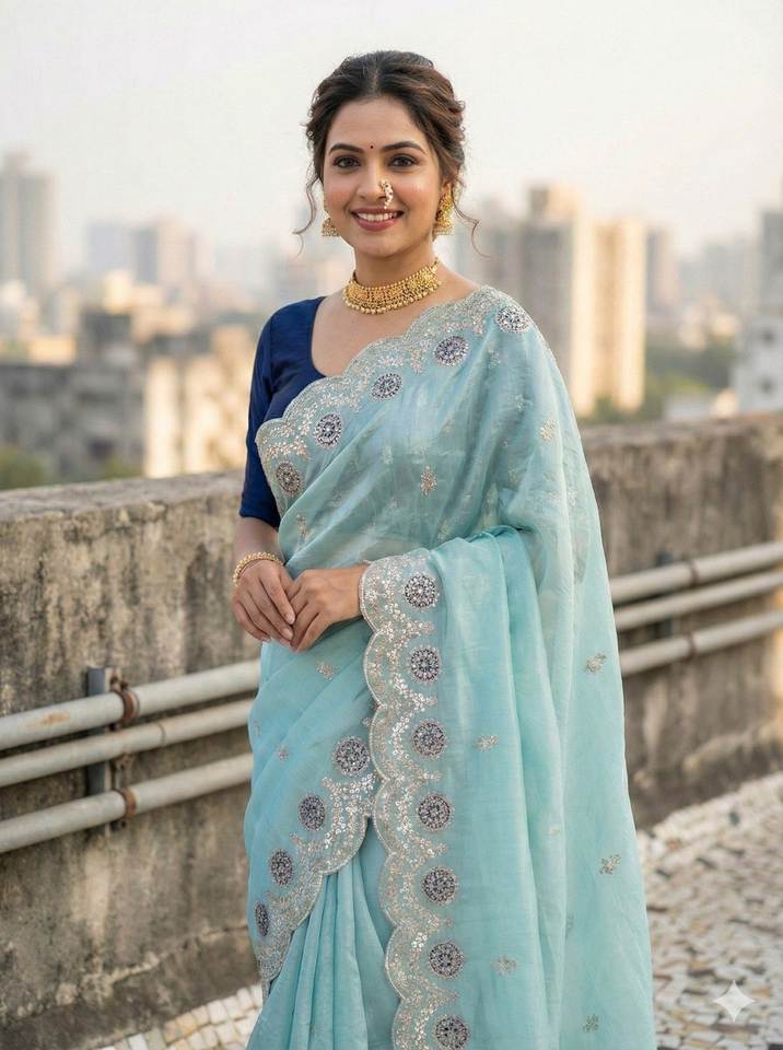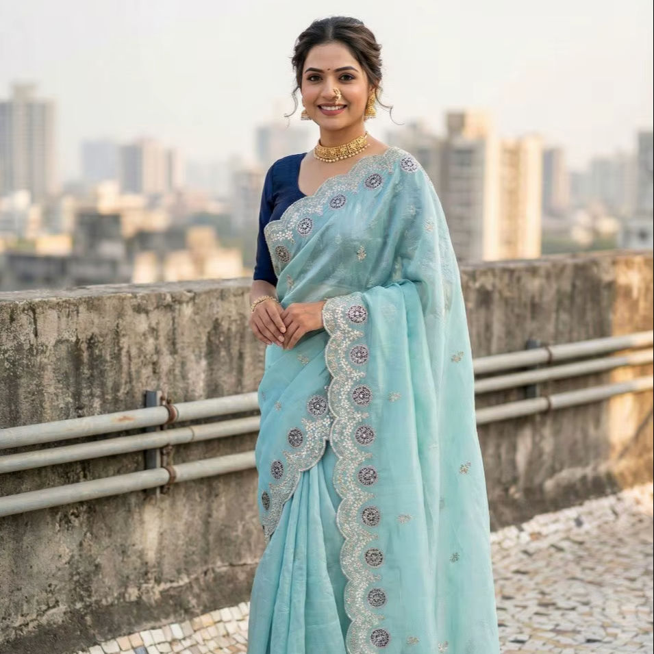 ชุดส่าหรีงานออกแบบสำหรับงานปาร์ตี้ - ผ้าโกลด์ครัชพร้อมขอบผ้าลายอาร์โคคัทและเสื้อปักลาย
