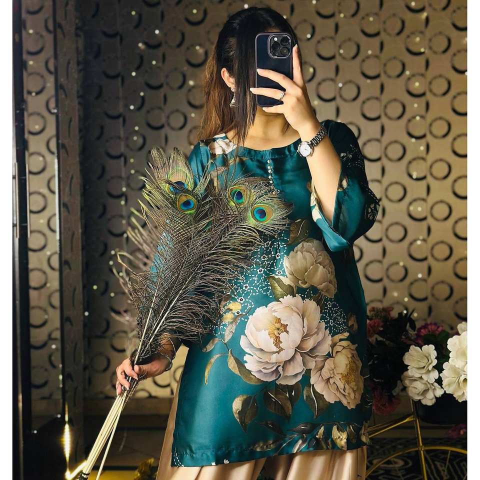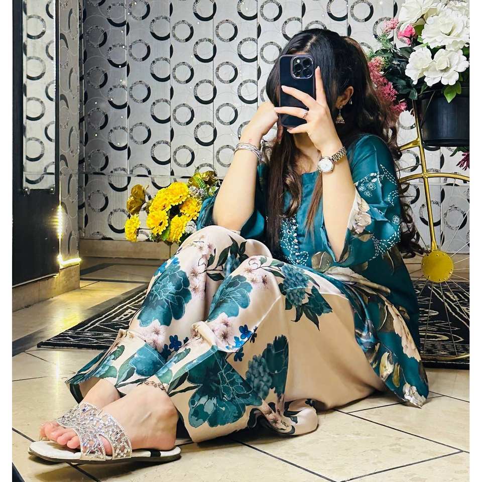ชุดเซ็ตเสื้อผ้าซาตินสำหรับงานปาร์ตี้ ดีไซน์เนอร์ พร้อมเสื้อคลุมและผ้าคลุมไหล่ แขนสามส่วน พิมพ์ลายดิจิทัล