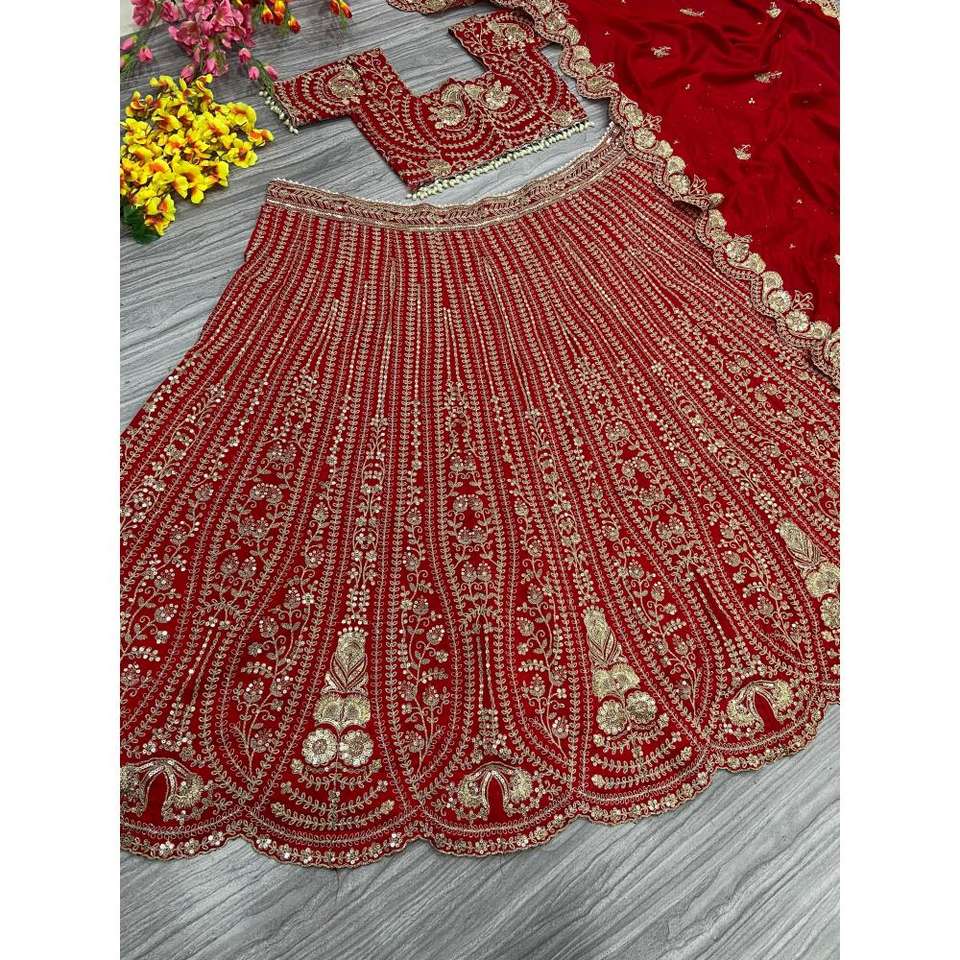 ชุดเลเฮนกาโชลีงานปักด้ายสวยงามสีแดงจากเฮร่า ครีเอชั่น สำหรับงานปาร์ตี้