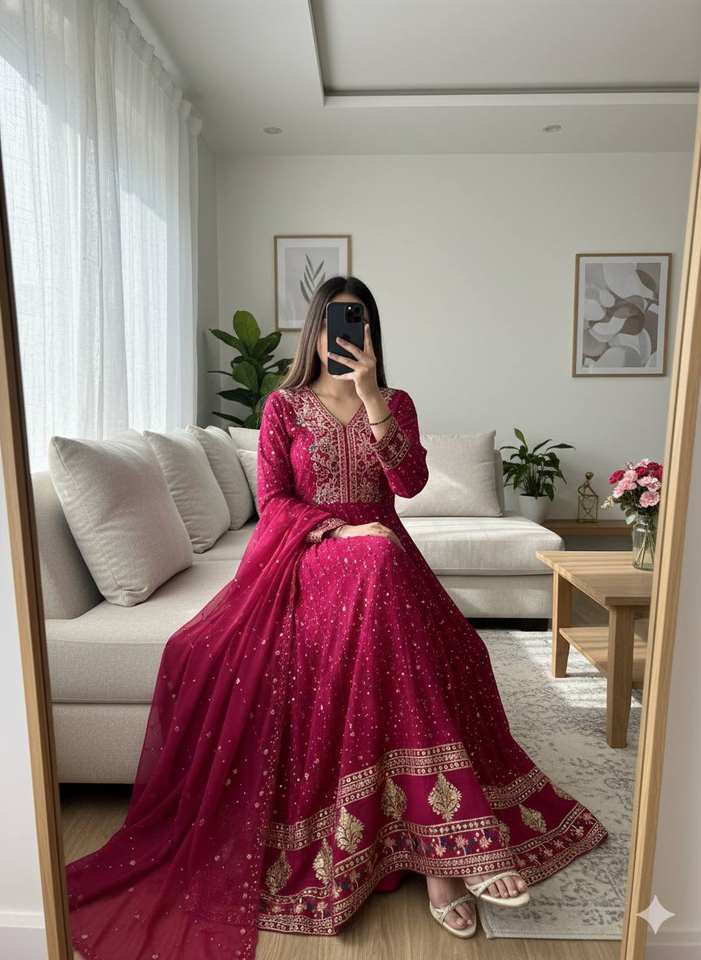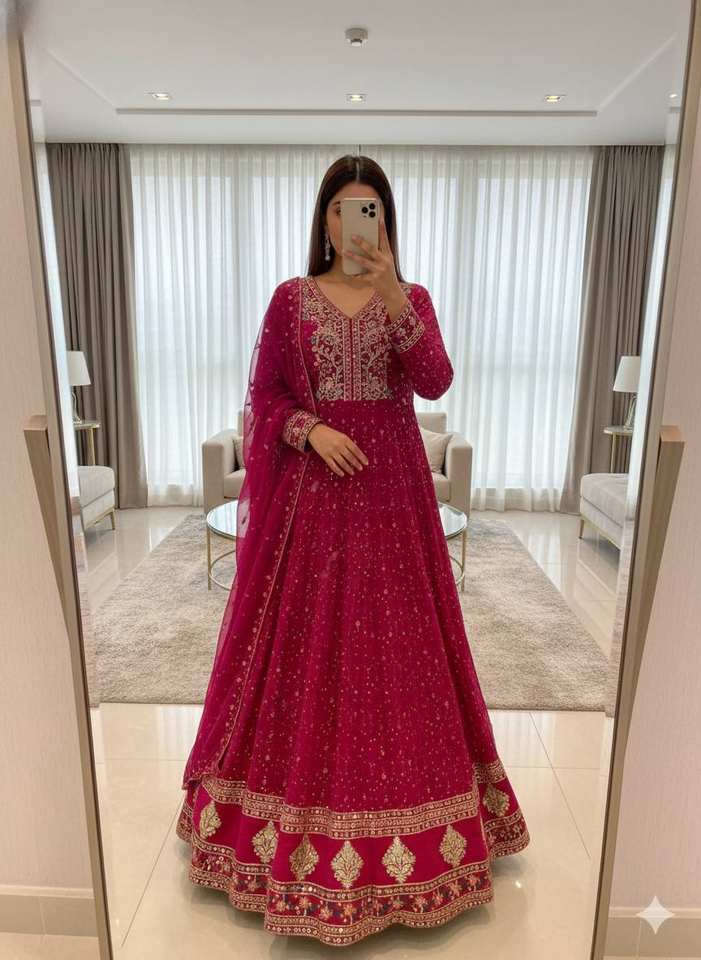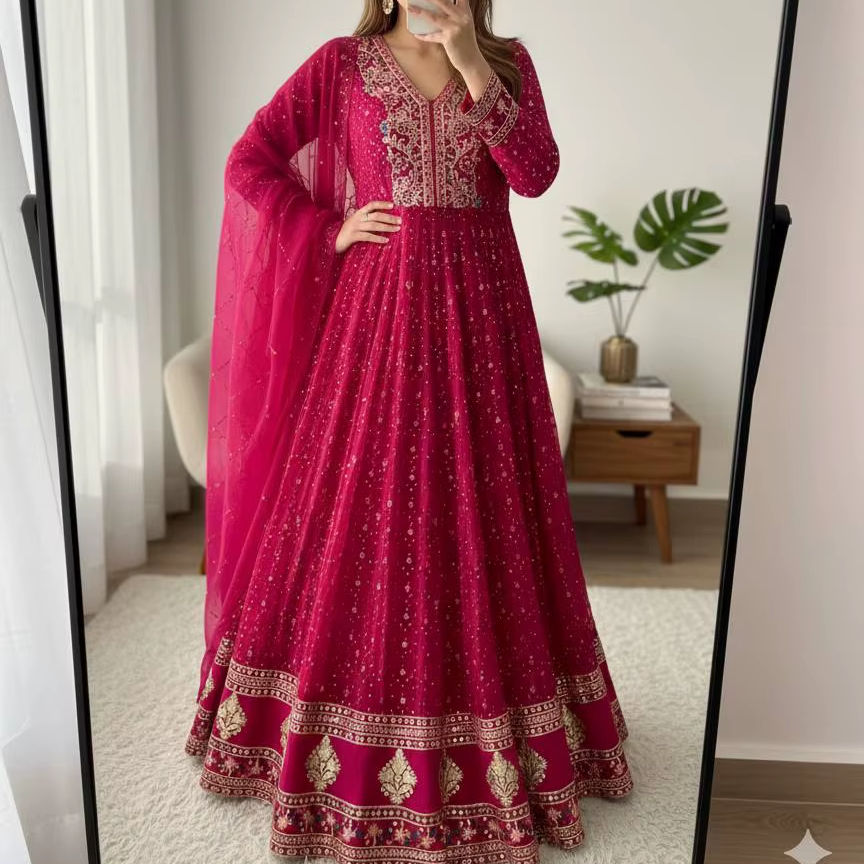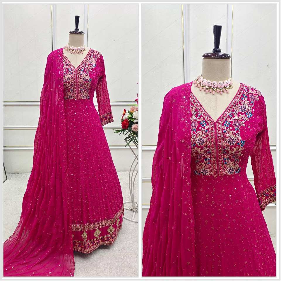 ชุดเดรสผ้าจอร์เจียแท้สีชมพูพร้อมงานปักขนาดใหญ่