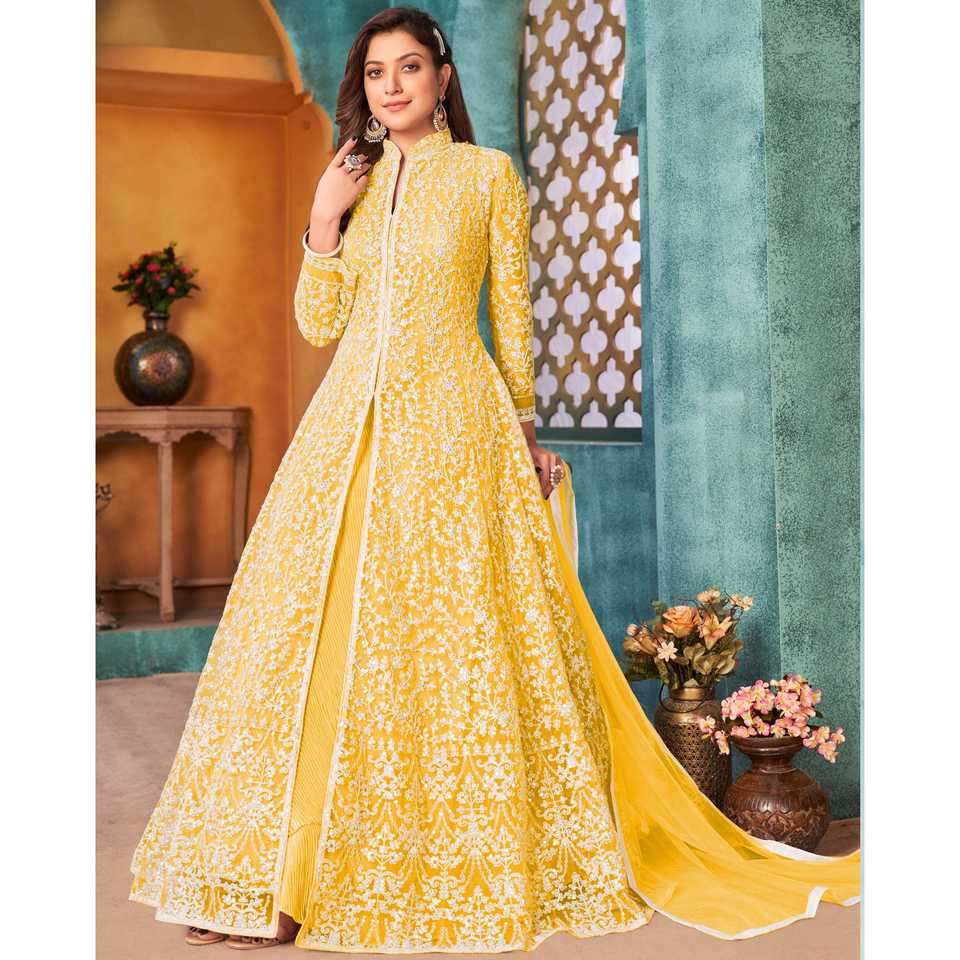 ชุดเดรส Anarkali สีเหลือง ดีไซน์เนอร์ โพลีเอสเตอร์ ประดับด้วยลูกปัดและเลื่อม สำหรับงานแต่งงาน พร้อมกางเกงและผ้าคลุมไหล่ ไซส์ M แบรนด์ Dani Fashion