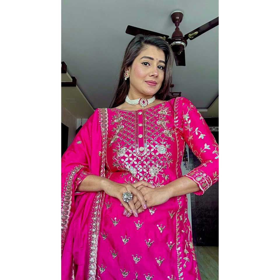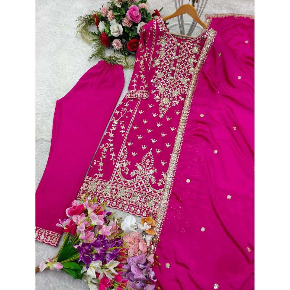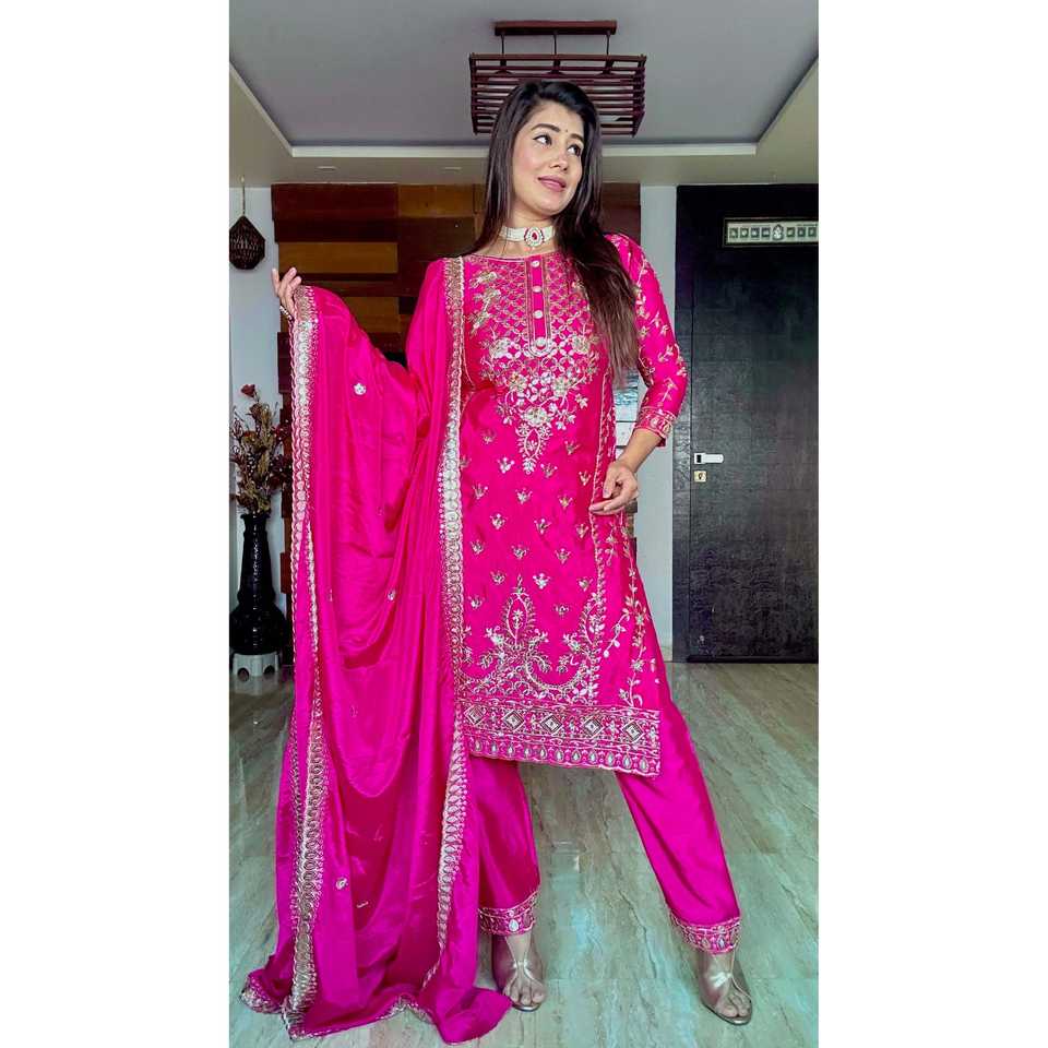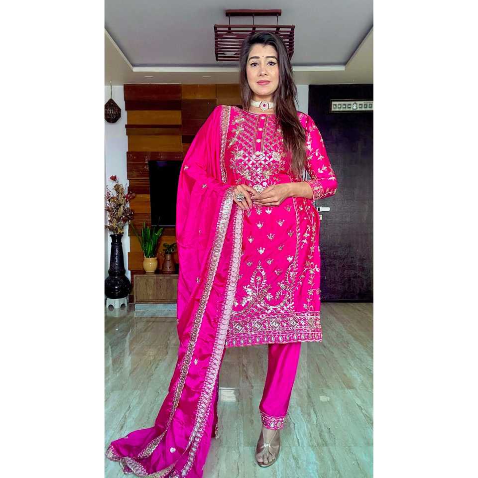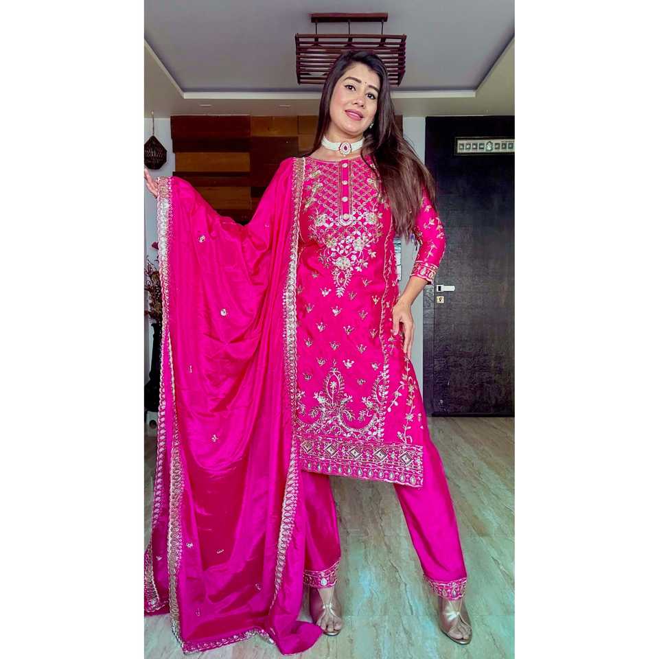 ชุดสัลวาร์ คามีซ ดีไซน์เนอร์ WW สีชมพูเข้ม ผ้าโพลีเอสเตอร์ สำหรับงานปาร์ตี้ ประกอบด้วยเสื้อ-กางเกงขายาว-ผ้าคลุมไหล่ ไซส์ M สำหรับโอกาสพิเศษ