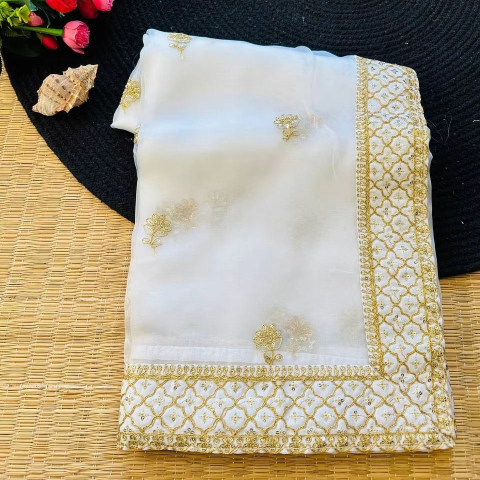 ส่าหรีผ้าไหมออร์แกนซอร์ซอฟต์แท้ดีไซเนอร์พร้อมด้วยงานปักที่สวยงามและลำดับขอบการทำงานสำหรับงานแต่งงานและงานปาร์ตี้