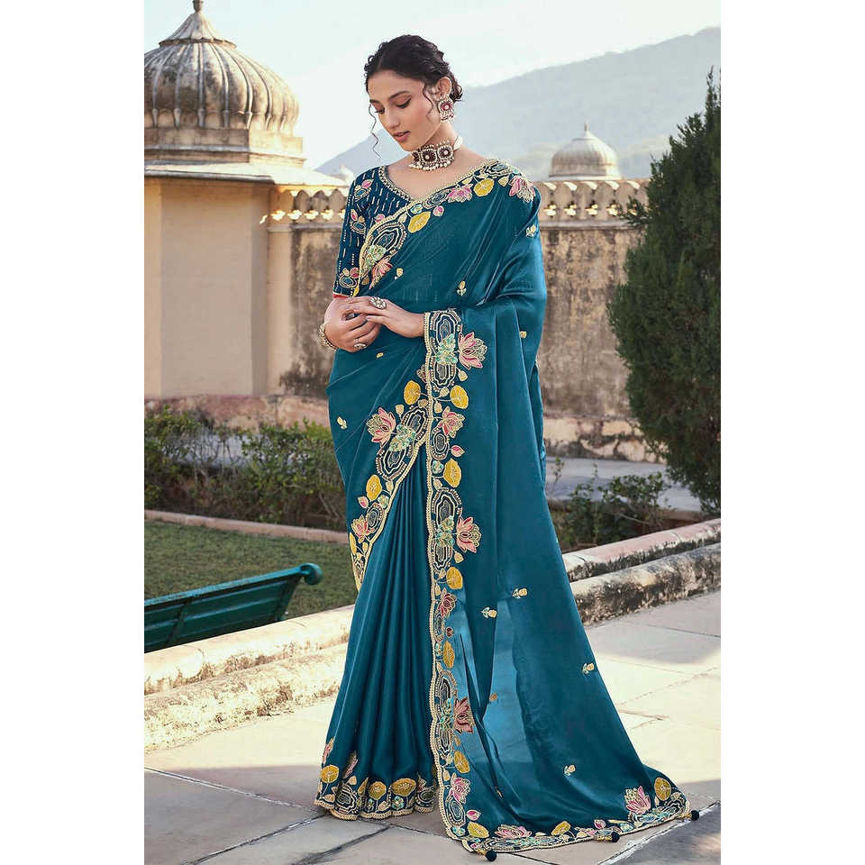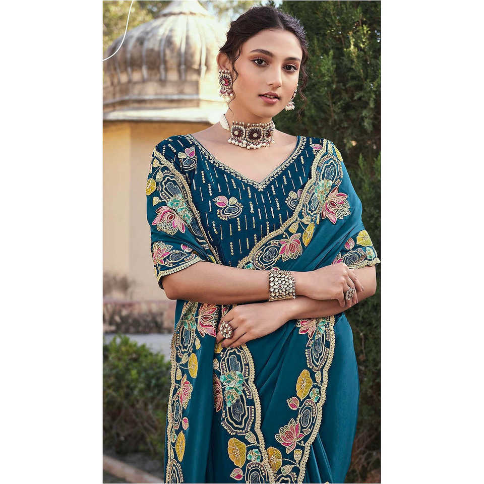 Saree ดีไซน์เนอร์สำหรับงานปักลายหลายดอกและปักเลื่อม