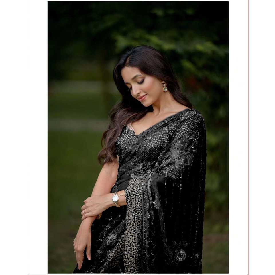 ผ้าส่าหรีดีไซเนอร์พร้อมลำดับปักและขอบลูกไม้ผลิตภัณฑ์ผ้าเลื่อมหรูหรา