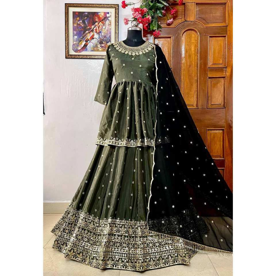 ชุดเลเฮนกาผ้าซาตินดีไซน์เนอร์พร้อมผ้าคลุมไหล่ งานปักเลื่อมสวยงาม ผ้าซาตินคุณภาพสูง