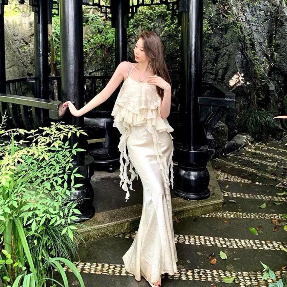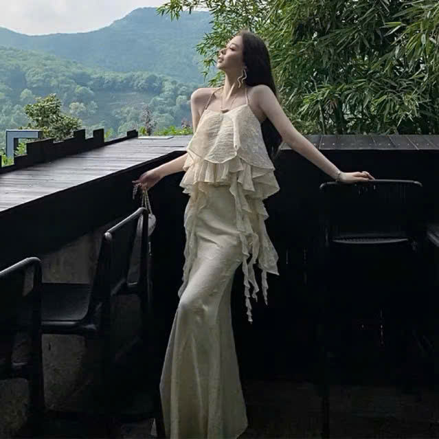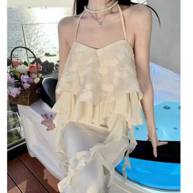 ชุดเสื้อสายเดี่ยวผ้าไหมผ้าชีฟองมีสองชิ้นกระโปรงยาวแต่งระบายเป็นชั้นประดับด้วยลายดอกไม้ชุดใส่ไปทะเลที่หรูหราสำหรับวันหยุดพักผ่อน