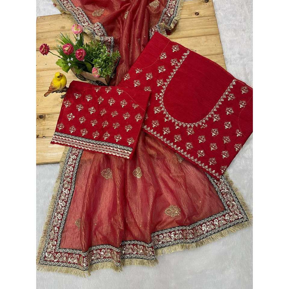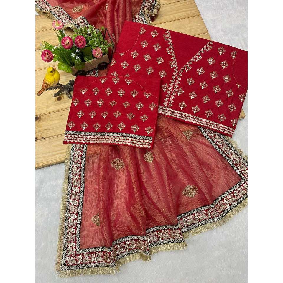 RV Creation Designer Red Indian/Pakistani Silk Saree for Weddings with Beautiful Jari Thread Embroidery and Diamonds