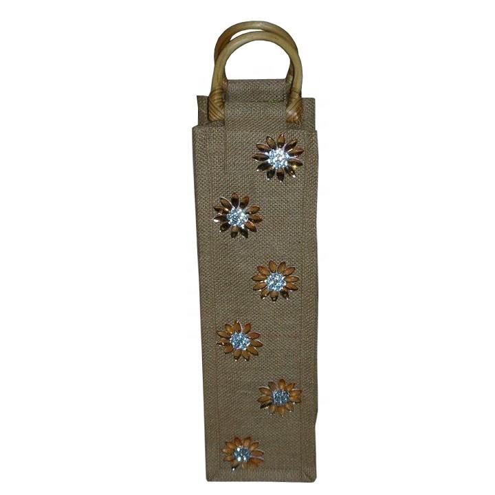 กระเป๋าใส่เหล้าขวดเดียวมีด้ามจับรูปตัว D ทำจากไม้กระเป๋าผ้ากระสอบเย็บ