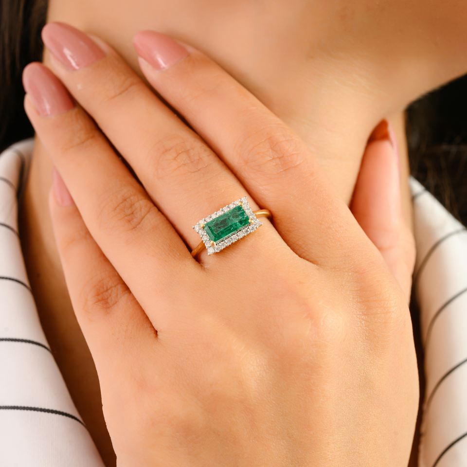 เครื่องประดับที่วางซ้อนกันได้ของนักออกแบบแหวนแต่งงานทรงแปดเหลี่ยมแซมเบียมรกตและเพชรสี K14ล้วนสีเหลืองทอง