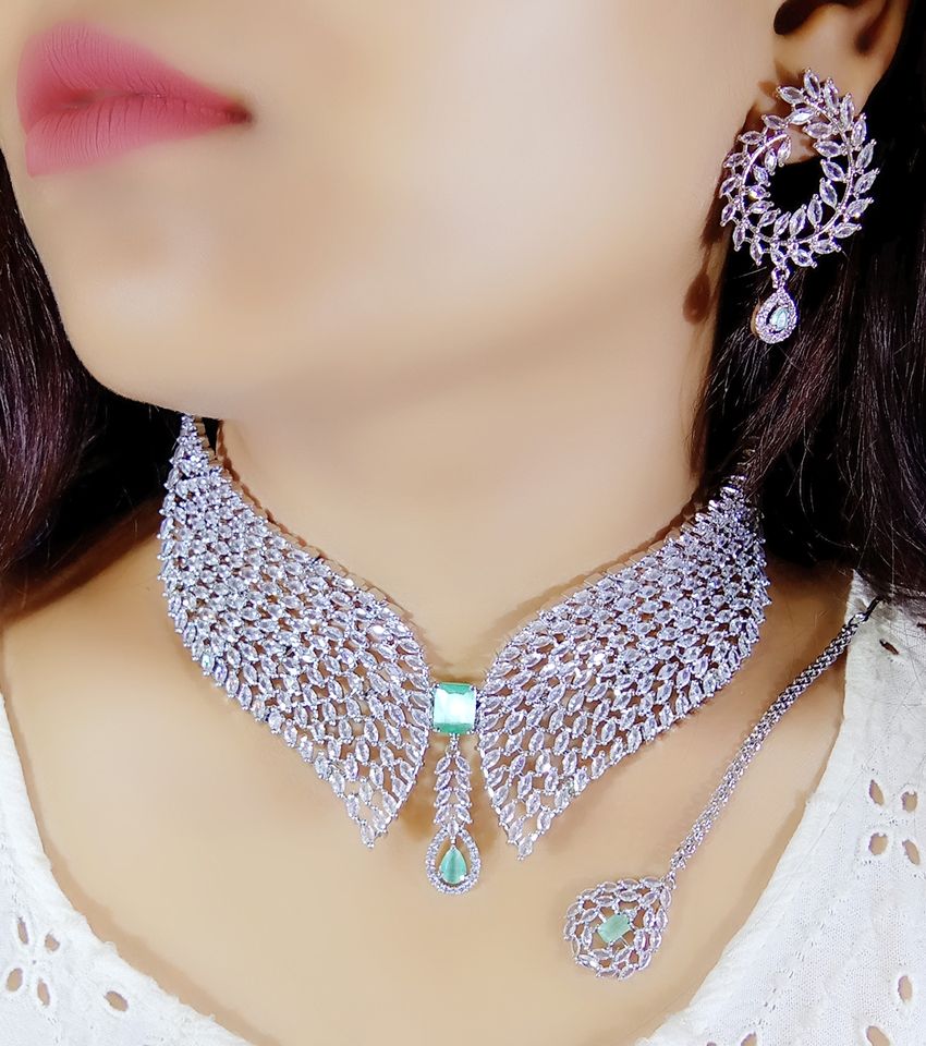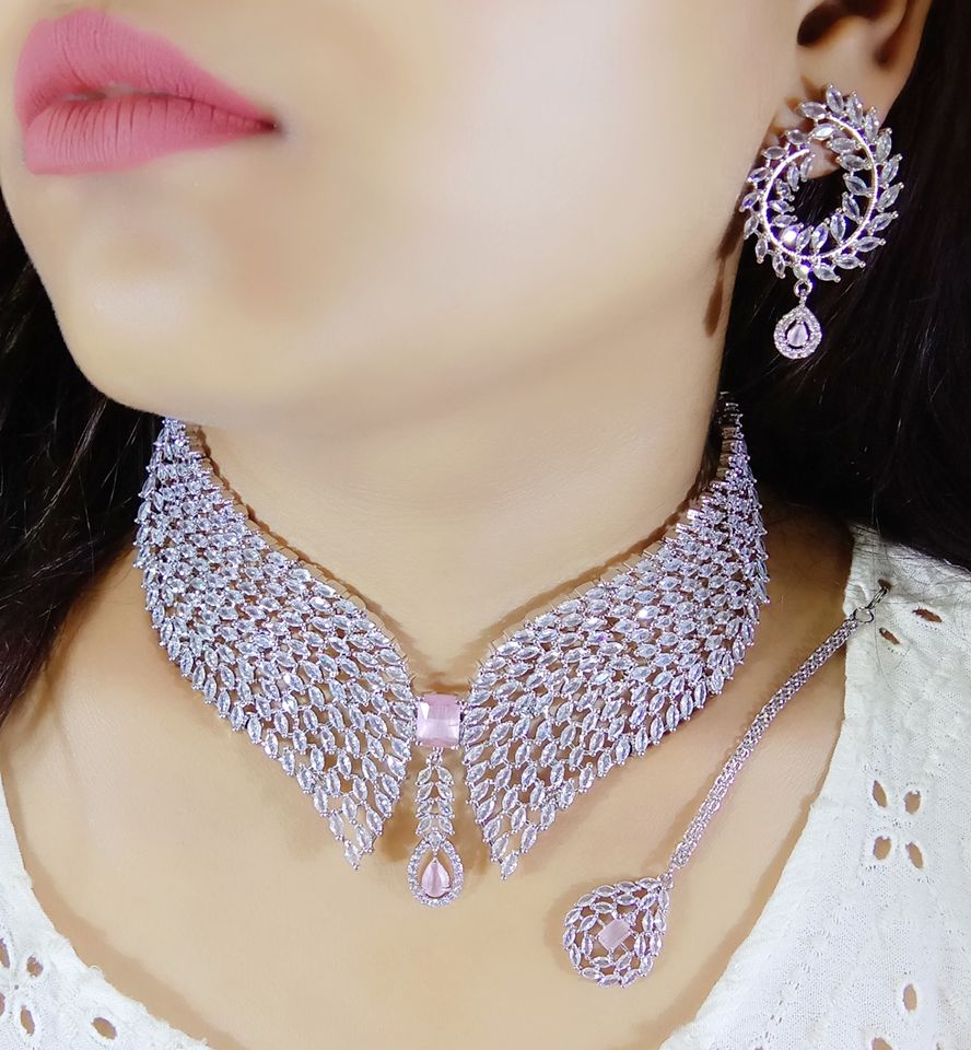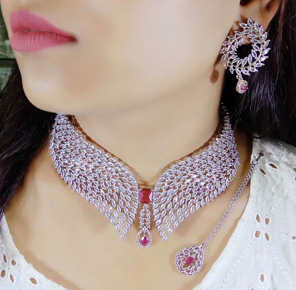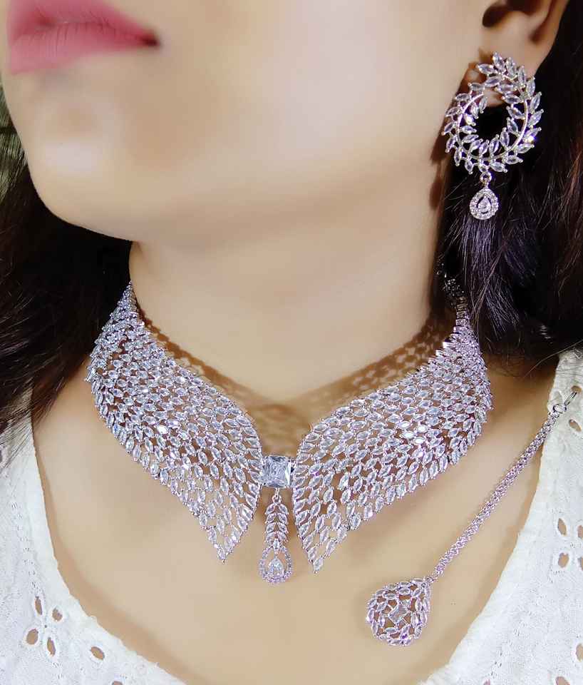 Star Cut American Diamond Necklace Set With Earrings And Maang Tikka