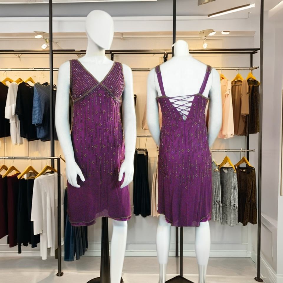 ชุดราตรีดีไซน์เนอร์สุดเก๋ ประดับลูกปัด หรูหรา สีม่วงสุดเซ็กซี่ ปักมือ คอแบบผูก ระบายอากาศได้ดี ความยาวระดับเข่า ผ้าธรรมชาติ