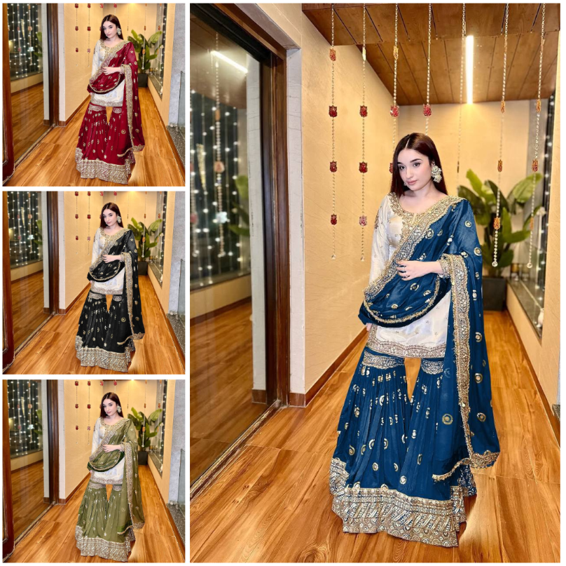 คู่ชาราสีขาวและสีฟ้าของนักออกแบบมีสไตล์ผ้าชินอนพร้อมงานเย็บปักถักร้อยตามลำดับสำหรับสตรีที่สวมใส่ในงานเทศกาล
