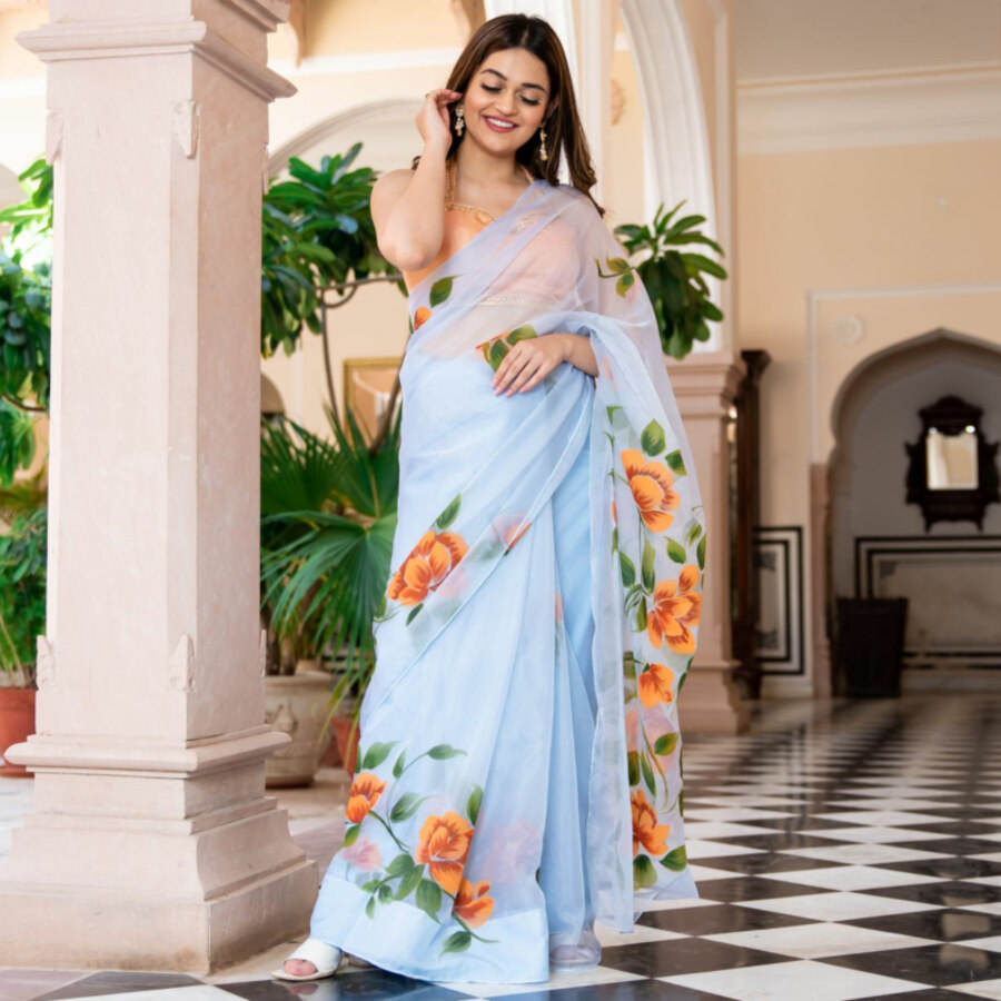 ผ้าซารีพิมพ์ลายดิจิทัลแบบออร์แกนซ่า ดีไซน์เนอร์ แทบบี้ พร้อมเสื้อปักลายสีฟ้าแบบยังไม่เย็บติดกับผ้า