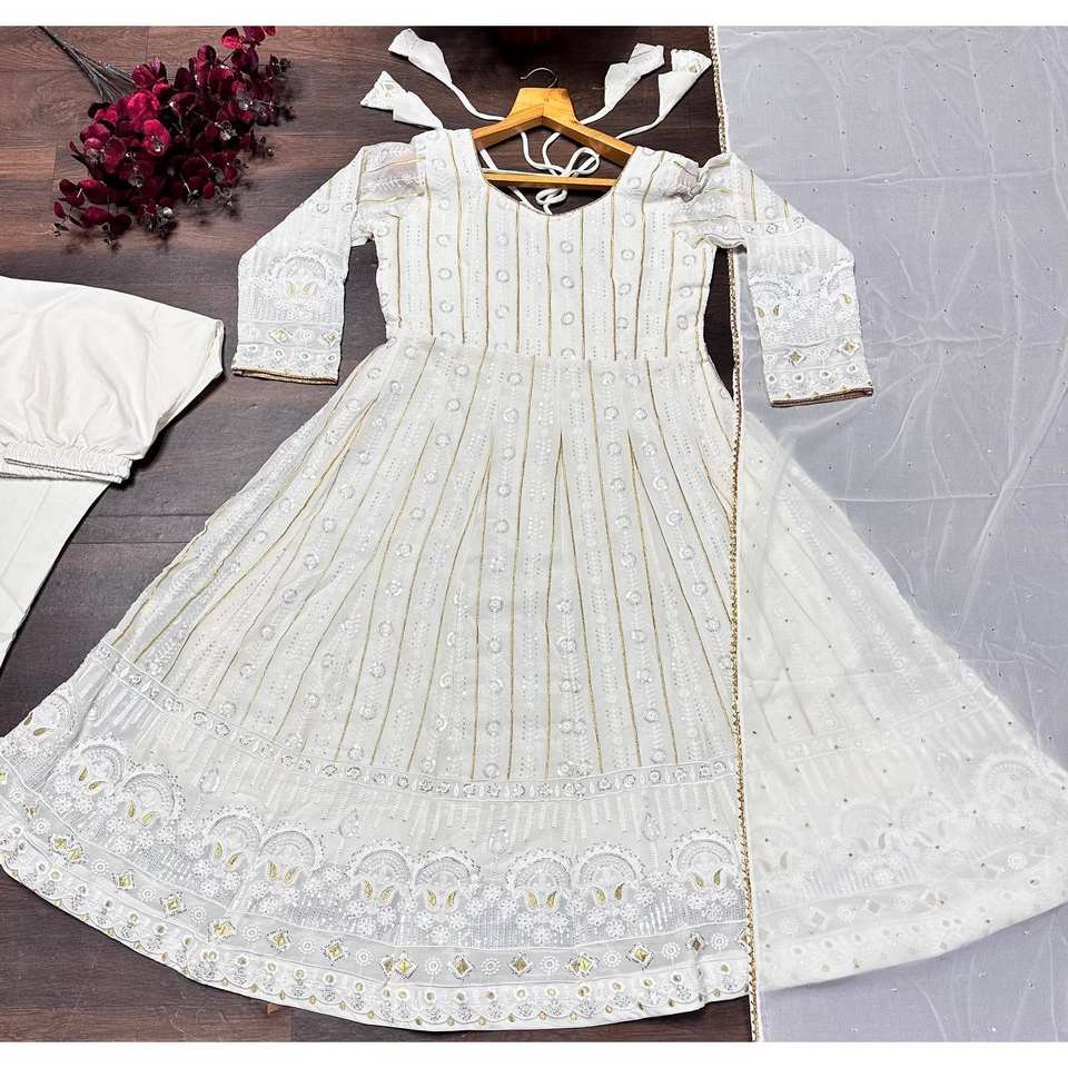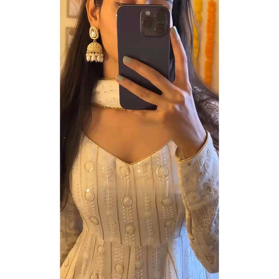 ชุดเดรส Anarkali ดีไซน์เนอร์หมายเลข 13 พร้อมกางเกงและผ้าคลุมไหล่ สีขาว ไซส์ XS เหมาะสำหรับงานแต่งงานและงานเลี้ยง