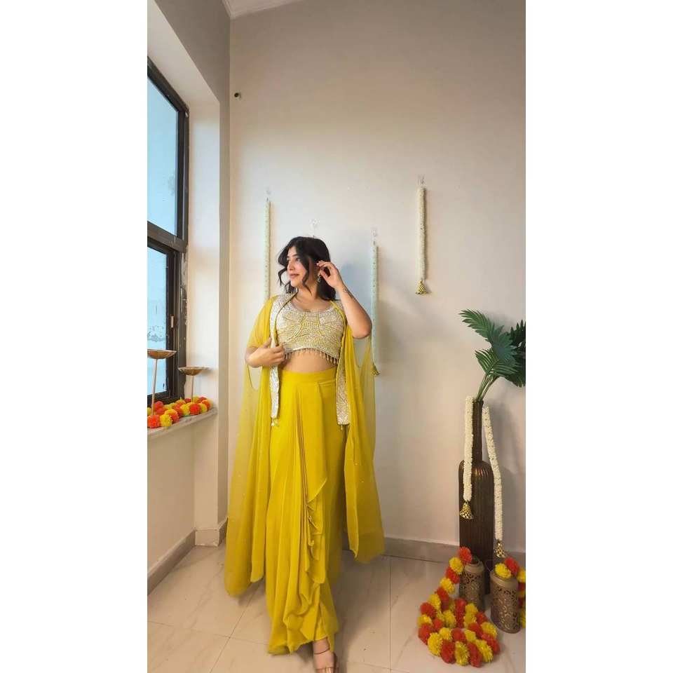 ชุดเลเฮนกาโชลีแบบอินโดเวสเทิร์นสามชิ้นสำหรับงานปาร์ตี้ ทำจากโพลีเอสเตอร์ ออกแบบโดยดีไซเนอร์