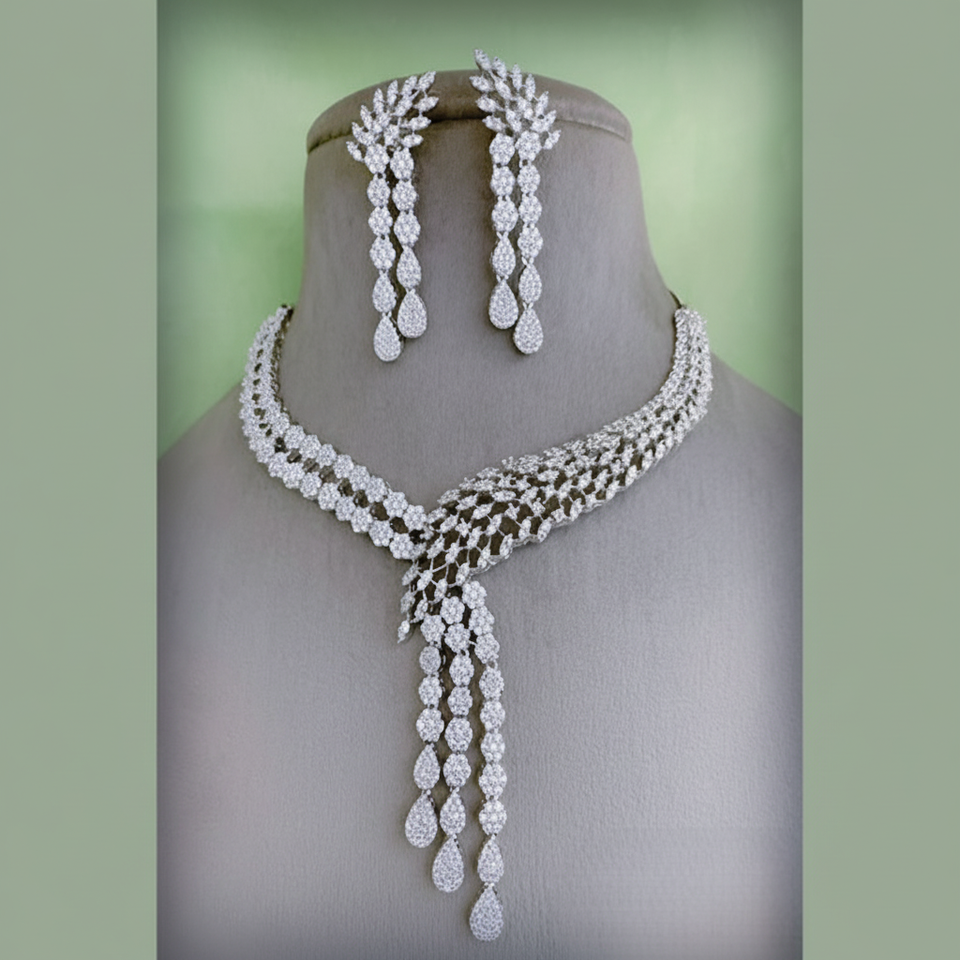ชุดสร้อยคอเพชรเพทายออกแบบทันสมัยพร้อมต่างหูประดับด้วยเงินพร้อมชุดหินรูปโฆษณาสำหรับงานแต่งงานสำหรับผู้หญิง