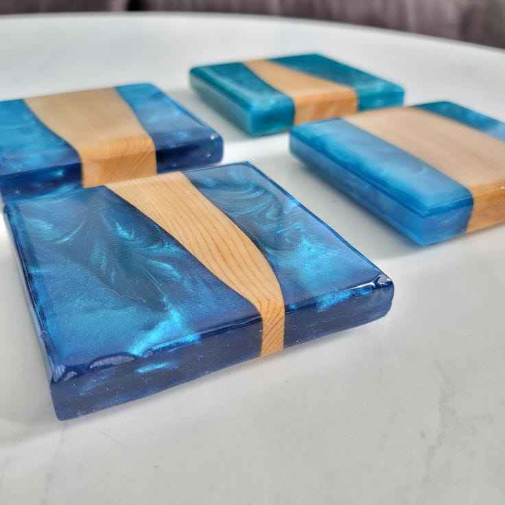 ชุดจานรองแก้วอีพ็อกซี่ลายไม้วอลนัทสำหรับเครื่องดื่ม งานแฮนด์เมดจากไม้วอลนัทและเรซิ่นสำหรับโต๊ะอาหาร