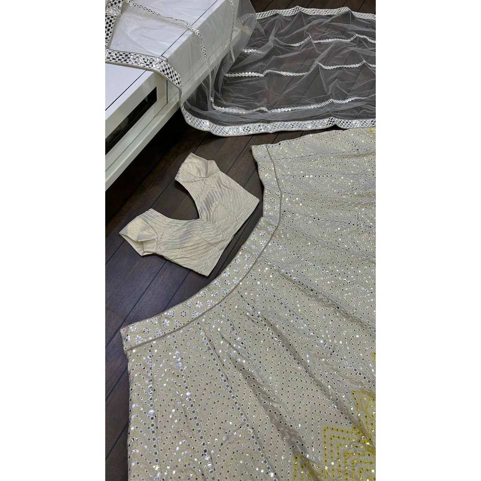ชุดแต่งงาน FB Designer Wedding Apparel สีขาวแบบเลเฮนกา โจลี ไซส์ M สำหรับงานปาร์ตี้ ตกแต่งด้วยงานปักดิ้นหลายเส้นและกระจกเงา