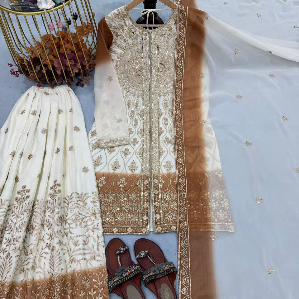 ชุดชาราร่าสำหรับงานแต่งงาน ดีไซน์เนอร์ ออกแบบสำหรับงานดิวาลี ผ้าจอร์เจตต์เนื้อหนัก ประดับดาว พร้อมกางเกงพลลาโซและผ้าคลุมไหล่