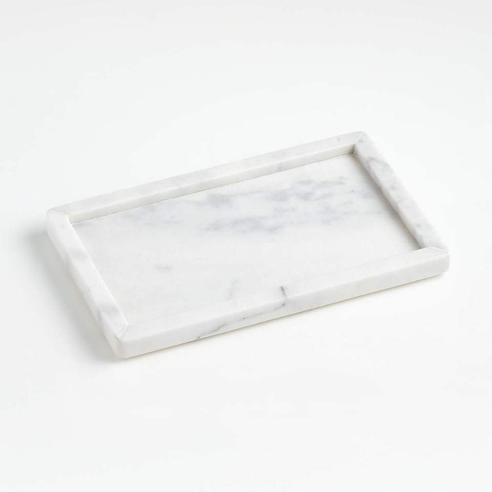 ถาดหินอ่อนสีขาวดีไซน์เนอร์ ขอบแข็งแรง สำหรับเสิร์ฟอาหารเช้า ของใช้ในโรงแรม และจัดระเบียบเคาน์เตอร์ครัวทันสมัย