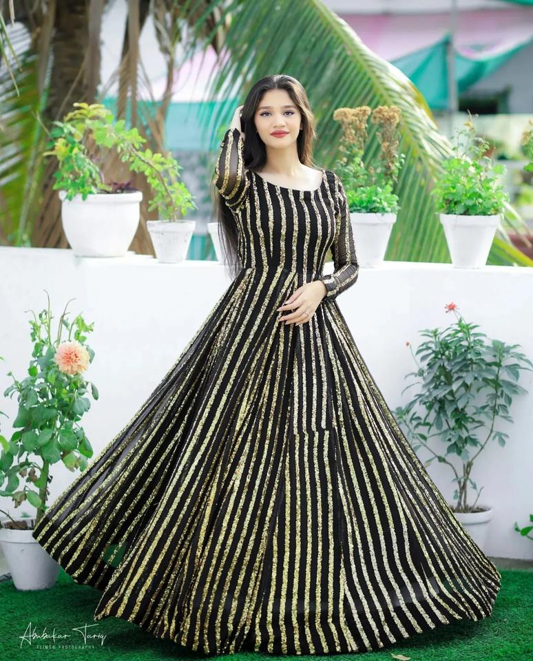 ชุดคลุมอนาร์คาลิสำหรับผู้หญิงจากดีไซเนอร์สำหรับงานปาร์ตี้แบบดั้งเดิมมีสไตล์และมีความยาวที่มีลวดลายปักที่หนักหน่วงทำจากผ้าจอร์เจียเจ็ต