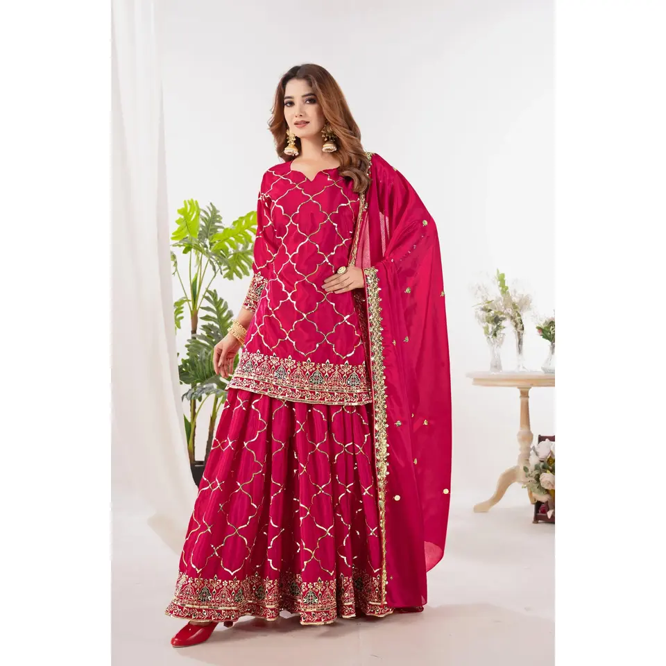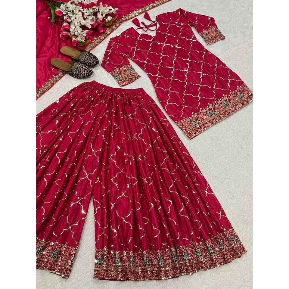 ชุดชาราราปักลายสำหรับผู้หญิง ดีไซเนอร์ พร้อมเสื้อท่อนบน กางเกงทรงพาลาซโซ และผ้าคลุมไหล่