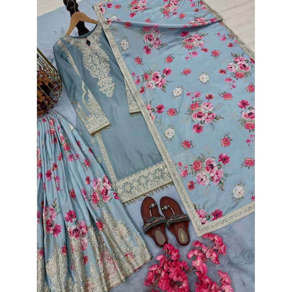 ชุดปาร์ตี้ออกแบบโดยดีไซเนอร์ของผู้หญิงมีลายปักเสื้อพลาสโซ & dupatta สำหรับโอกาสที่ทันสมัย